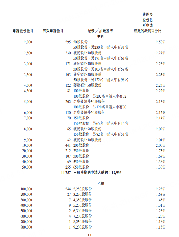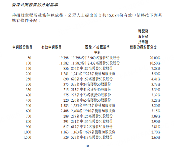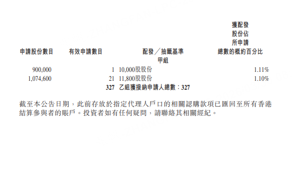 香港公开发售获50.66倍超额认购,合共接获约45084份有效申请,获受理申请约13260份,一手中签率为20%;公开发售最终股份数目为214.93万股,占发售总数的10%。国际发售获1.95倍认购,最终分配股份1934.28万股,占发售总数的90%。