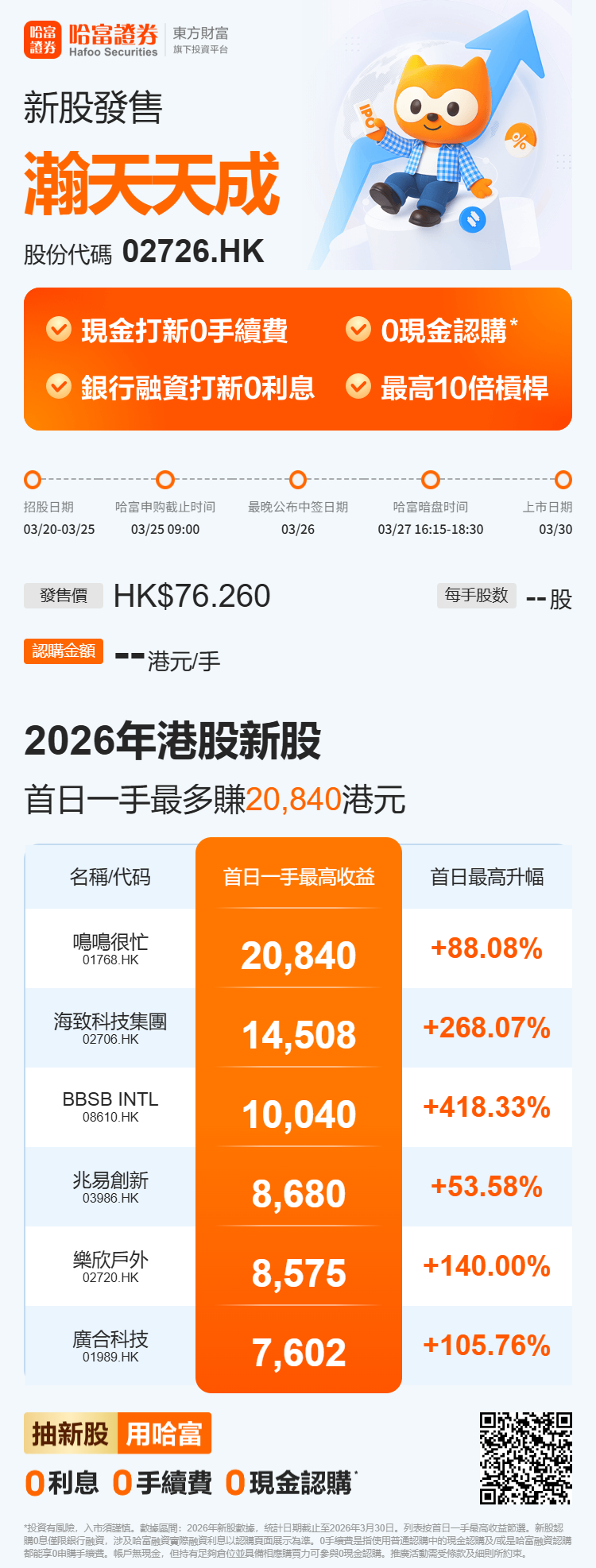 瀚天天成(02726.HK)公布配发结果,公司全球发售2149.205万股H股,其中香港公开发售占10%,国际发售占90%。最终发售价为每股76.26港元,全球发售净筹约15.6亿港元,股份每手50股,预期于2026年3月30日上午九时正在联交所挂牌买卖。