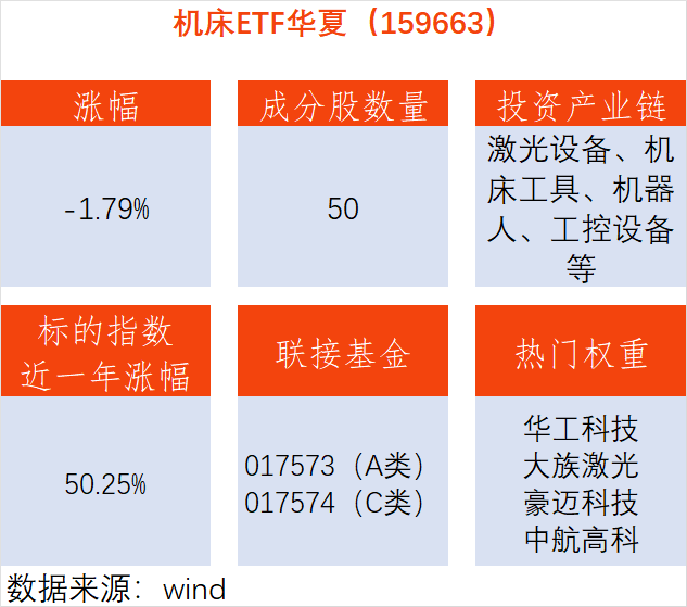机床ETF华夏(159663),紧密跟踪的中证机床指数,涵盖了我国制造业产业链中的关键一环——高端装备制造领域,涉及激光设备、机床工具、机器人、工控设备等行业,是新质生产力理念强调创新驱动与产业升级落地实践的核心阵地。