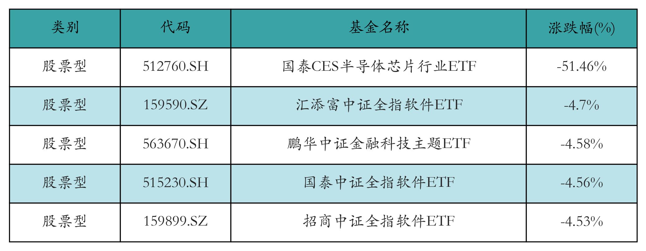 上周股票型ETF跌幅最大的5只ETF及其收益率分别为:国泰CES半导体芯片行业ETF(-51.46%)、汇添富中证全指软件ETF(-4.7%)、鹏华中证金融科技主题ETF(-4.58%)、国泰中证全指软件ETF(-4.56%)、招商中证全指软件ETF(-4.53%)。详情见下表:
