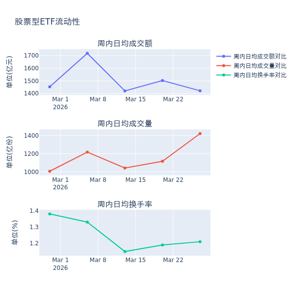 流动性方面,上周股票型ETF市场日均成交额减少5.4%,日均成交量增加27.3%,换手率增加0.02%。