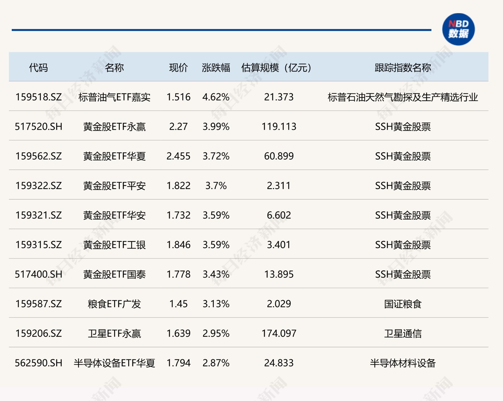ETF涨跌幅方面,标普油气ETF嘉实涨超4%,黄金股相关ETF涨超3%。