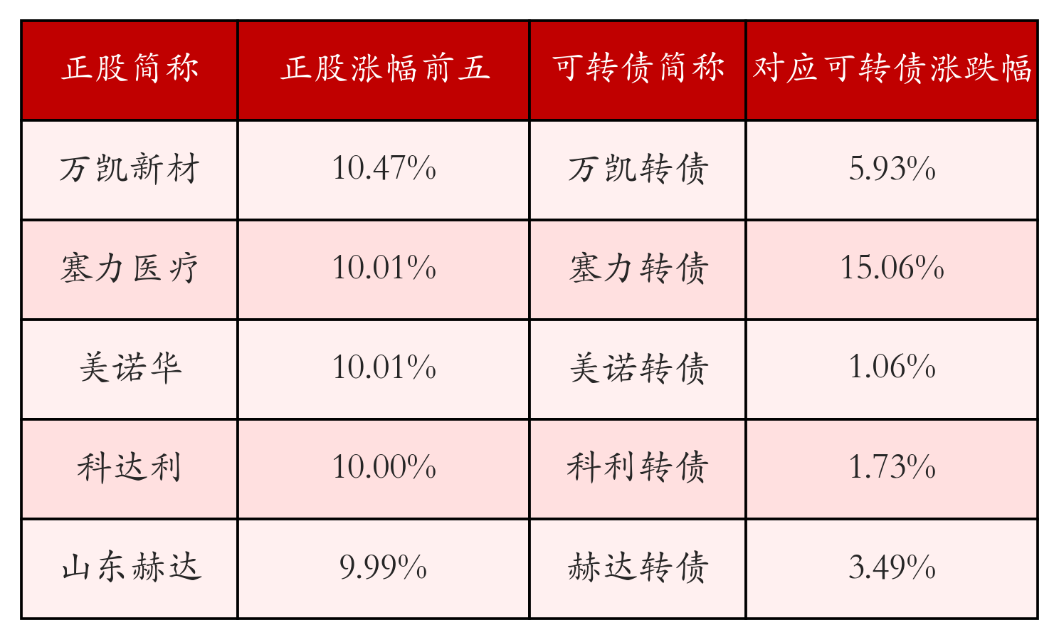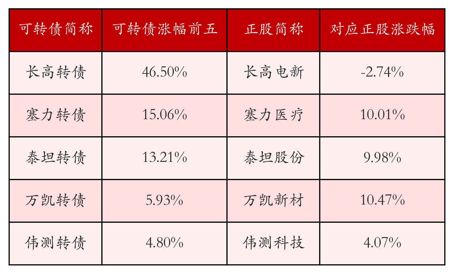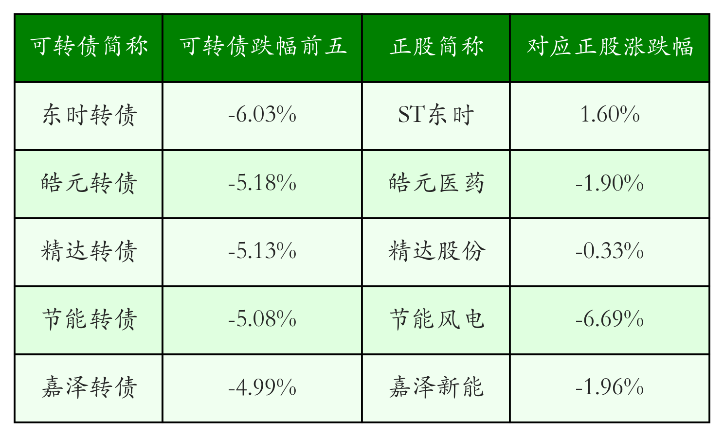 南财智讯3月30日电,盘后数据显示,债市方面,中证转债指数收跌0.93%,报494.31,成交额为615.04亿元。可转债方面,今日共成交349只可转债,其中49只收涨,0只收平,300只收跌。具体来看,9只可转债涨幅超过2%。其中长高转债(127113)涨46.5%,塞力转债(113601)涨15.06%,泰坦转债(127096)涨13.21%。今日有44只可转债跌幅超2%,东时转债(113575)跌6.03%,皓元转债(118051)跌5.18%,精达转债(110074)跌5.13%。存在交易量的可转债所对应的正股中,159只收涨,11只收平,179只收跌。具体来看,18只可转债对应正股涨幅超过5%,其中,塞力医疗(603716)涨停,收涨10.01%;美诺华(603538)涨停,收涨10.01%。同时所对应的可转债:塞力转债(113601)同涨15.06%;美诺转债(113618)同涨1.06%。今日有7只可转债对应正股跌幅超过5%,绿色动力(601330)跌停,收跌10.01%。同时所对应的可转债:绿动转债(113054)同跌2.78%。