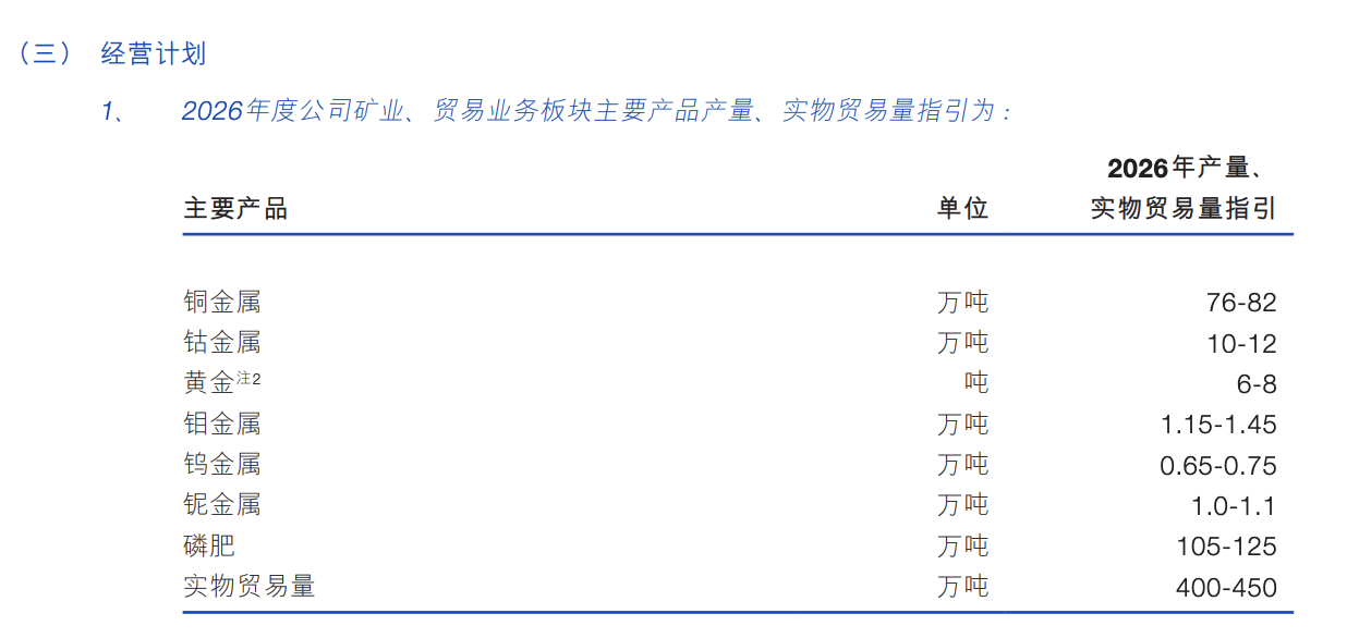 洛阳钼业过去主要生产铜、钴、钼、钨、铌和磷肥,2026年开始生产黄金。