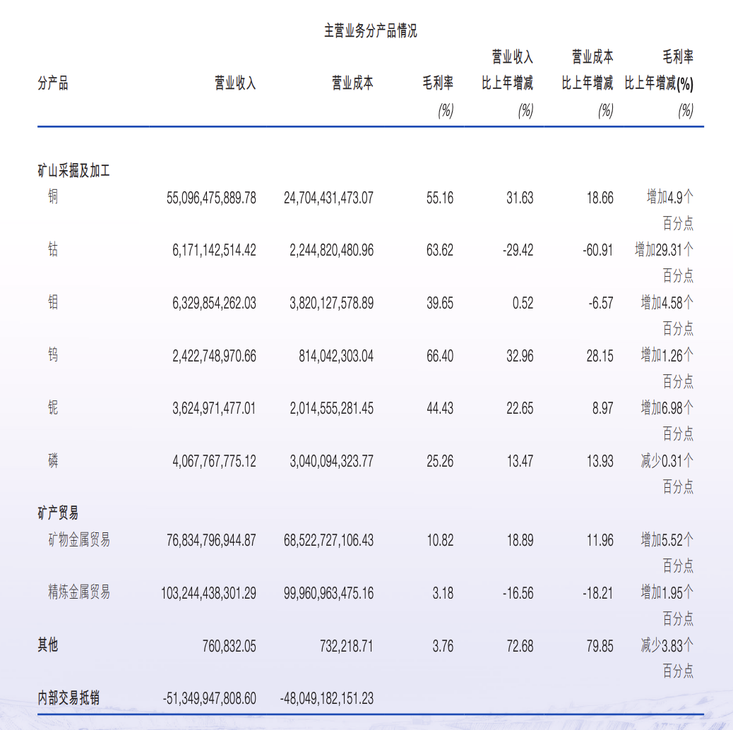 这主要得益于该公司在刚果(金)的TFM和KFM两大世界级矿山的运营。其中,TFM拥有45万吨以上的年产铜能力,KFM则是全球第一大单体钴矿山,拥有年产15万吨铜以上的能力。
