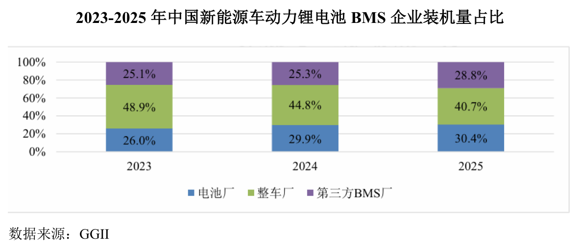 BMS市场长期呈现“三足鼎立”格局——整车厂、动力电池厂和第三方厂商各据一方,而第三方厂商的市场份额长期被压制在30%以下。尽管公司凭借技术优势在第三方阵营中占据龙头地位,但比亚迪(002594.SZ)、宁德时代等巨头正在不断侵蚀市场边界。
