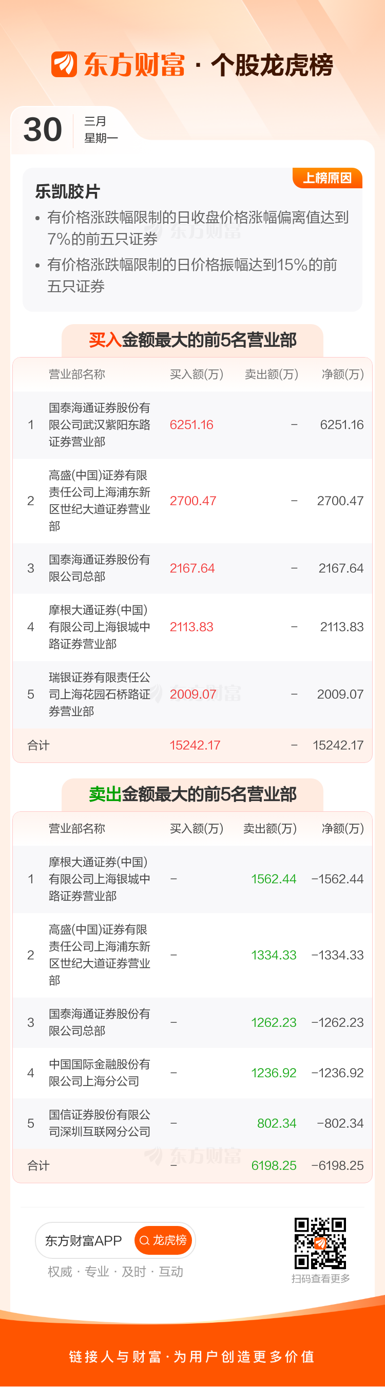 乐凯胶片(600135)龙虎榜数据(03-30)