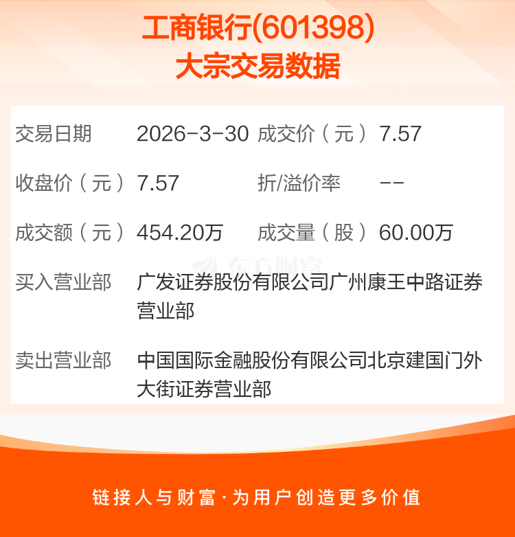 2026年3月30日,工商银行发生1笔大宗交易,共成交60.00万股,成交金额454.20万元。