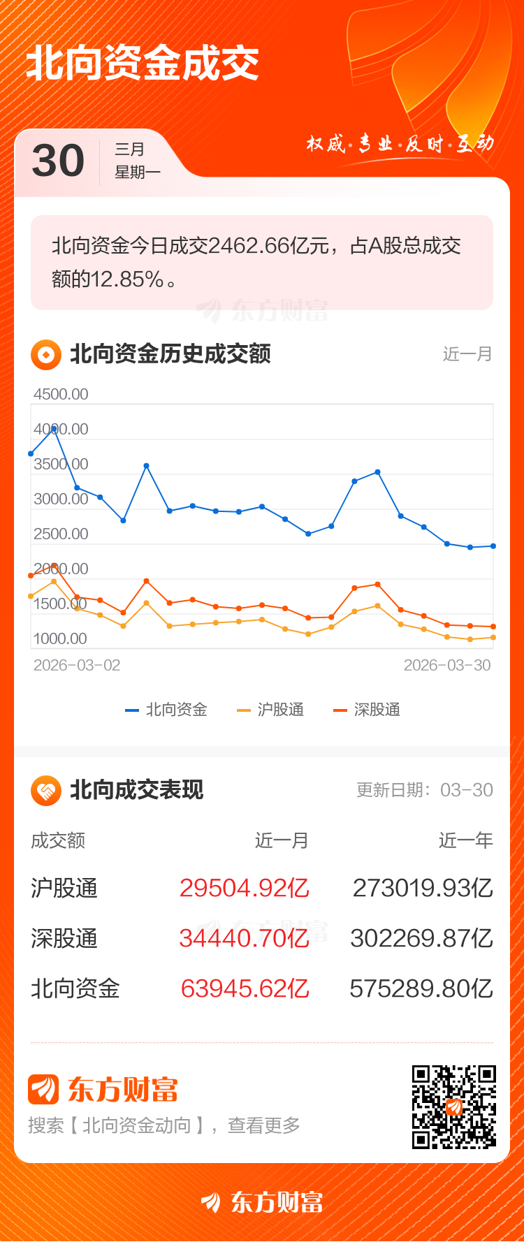 交易所最新数据显示,3月30日北向资金共成交2462.66亿元,占两市总成交额的12.85%。