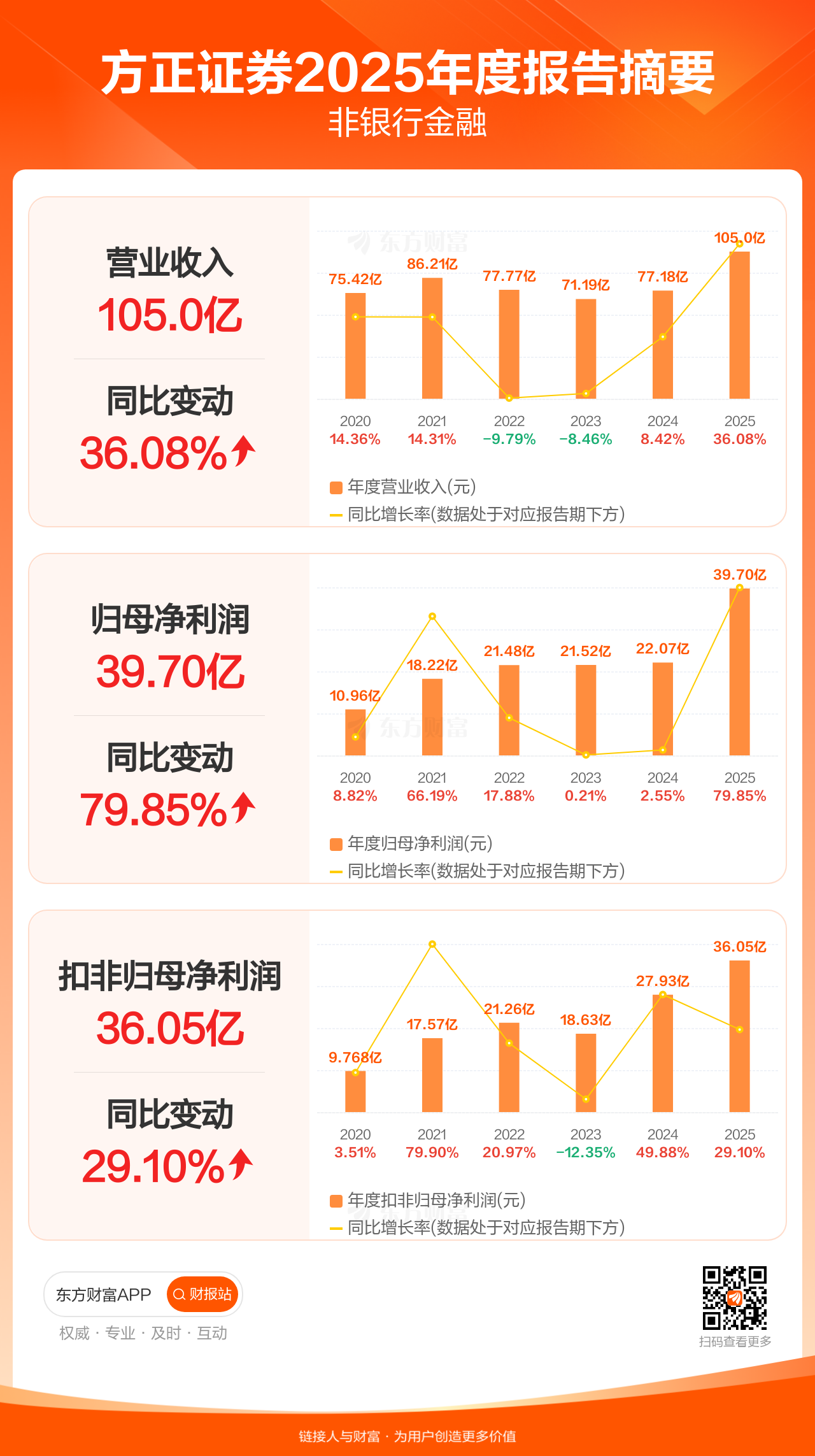 方正证券3月31日发布2025年年报显示,公司全年实现营业收入105.04亿元,同比增长36.08%;归母净利润39.70亿元,同比增长79.85%;扣非归母净利润36.05亿元,同比增长29.10%。