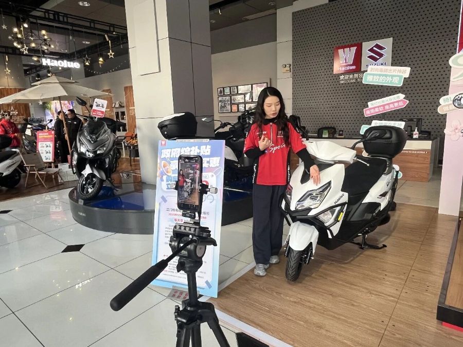 图为江门一摩托车线下店,主播正在推介车型,吸引众多车友在线咨询下单