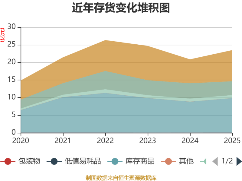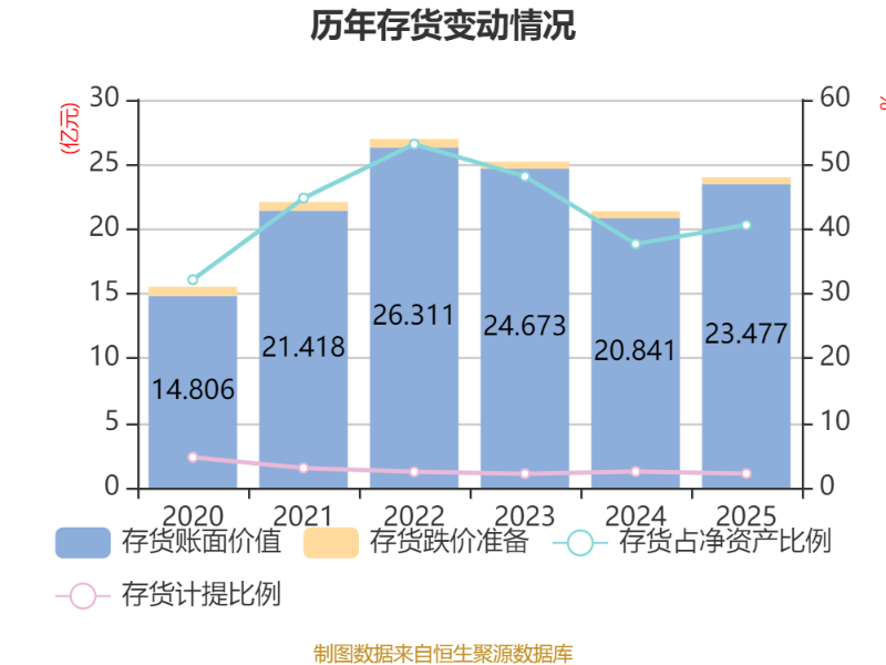 从存货变动来看,截至2025年末,公司存货账面价值为23.48亿元,占净资产的40.62%,较上年末增加2.64亿元。其中,存货跌价准备为5260.46万元,计提比例为2.19%。