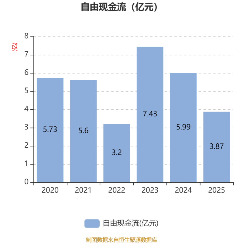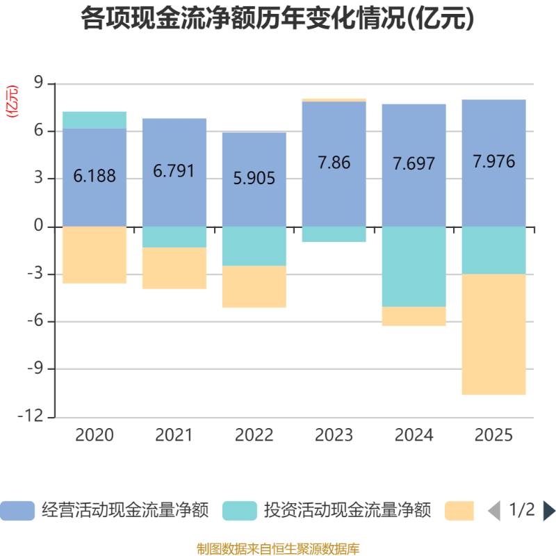 截至2025年,公司经营活动现金流净额为7.98亿元,同比增长3.63%;筹资活动现金流净额-7.6亿元,同比减少6.4亿元;投资活动现金流净额-3.01亿元,上年同期为-5.06亿元。