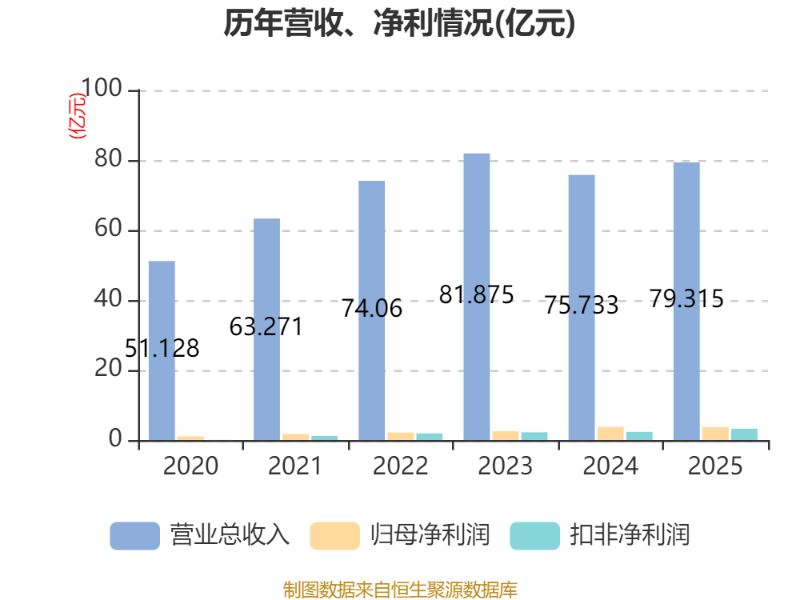 中证智能财讯安泰科技(000969)3月31日披露2025年年度报告。2025年,公司实现营业总收入79.32亿元,同比增长4.73%;归母净利润3.65亿元,同比下降2.02%;扣非净利润3.22亿元,同比增长38.16%;经营活动产生的现金流量净额为7.98亿元,同比增长3.63%;报告期内,安泰科技基本每股收益为0.3509元,加权平均净资产收益率为6.45%。公司2025年度分配预案为:拟向全体股东每10股派现2元(含税)。