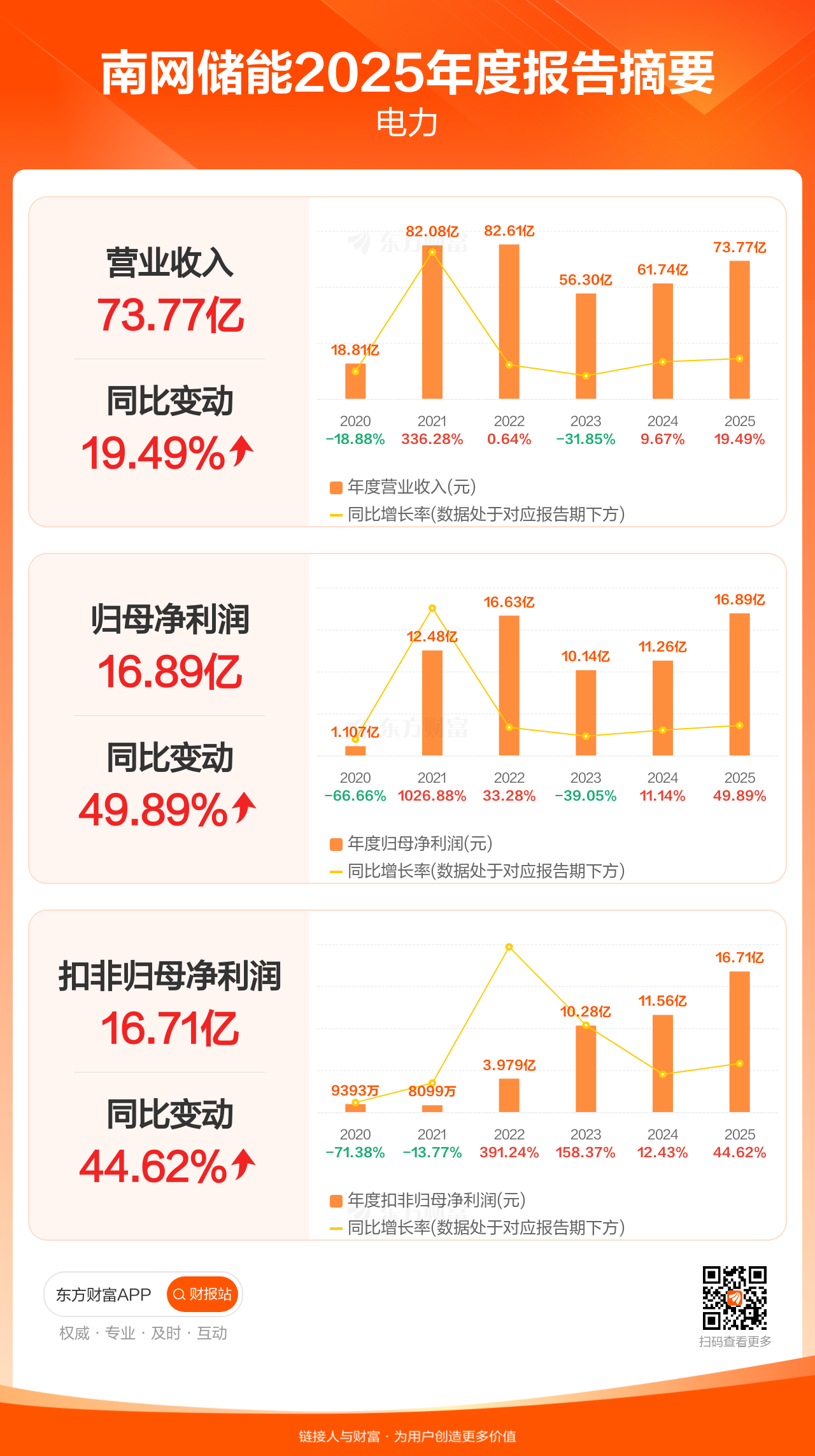 南网储能3月31日发布2025年年报显示,公司全年实现营业收入73.77亿元,同比增长19.49%;归母净利润16.89亿元,同比增长49.89%;扣非归母净利润16.71亿元,同比增长44.62%。