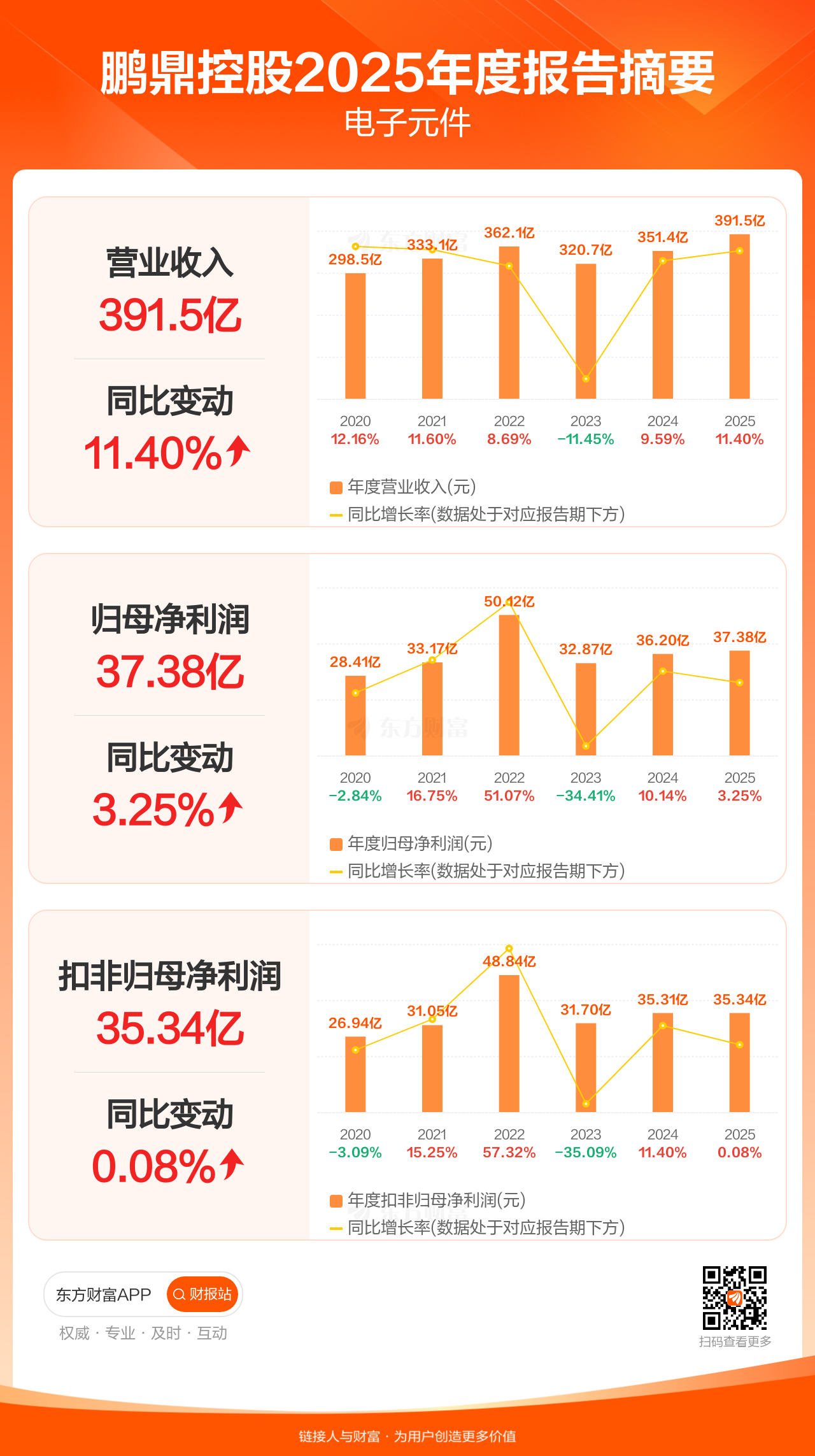 鹏鼎控股3月31日发布2025年年报显示,公司全年实现营业收入391.47亿元,同比增长11.40%;归母净利润37.38亿元,同比增长3.25%;扣非归母净利润35.34亿元,同比增长0.08%。