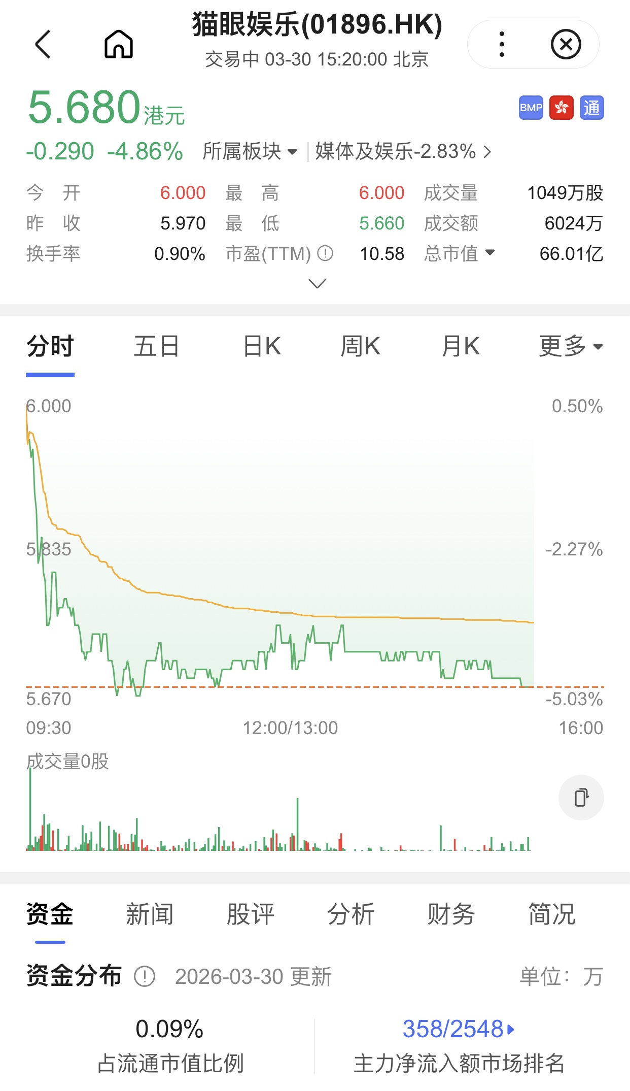 具体来看,2025年,公司在线娱乐票务服务收入22.94亿元,同比增长19.36%;娱乐内容服务收入21.27亿元,同比增长8.54%;广告服务及其他业务收入2.11亿元,同比增长4.93%。董事会建议派付截至2025年12月31日止年度的末期股息每股0.22港元。截至3月30日下午,猫眼娱乐的股价为5.680港元/股。