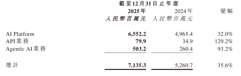 具体来看,以算力为计价的AI platform业务收入65.52亿元,同比增长32.0%,占总收入的91.8%;按token使用量付费模式的API(应用接口)业务收入7990万元,同比增长129.2%,占总收入的1.1%;以“按结果付费”为核心模式的Agentic AI(智能体AI)业务收入5.03亿元,同比增长93.2%,占总收入的7.1%。