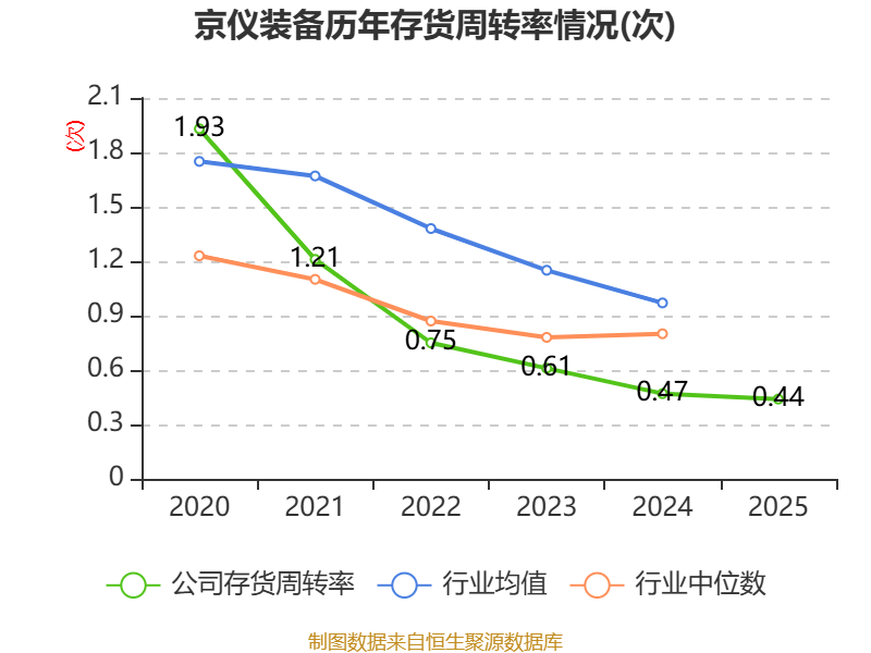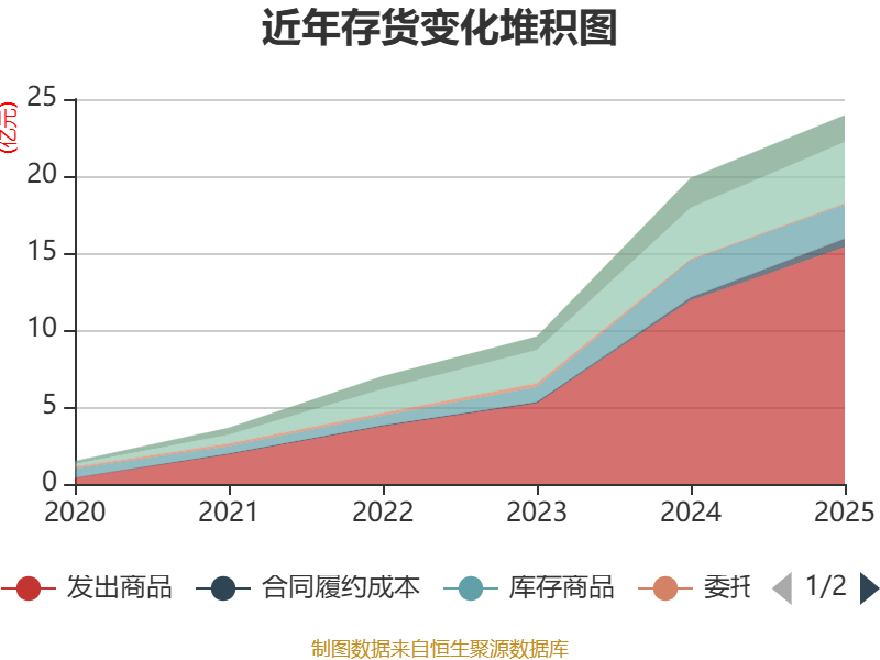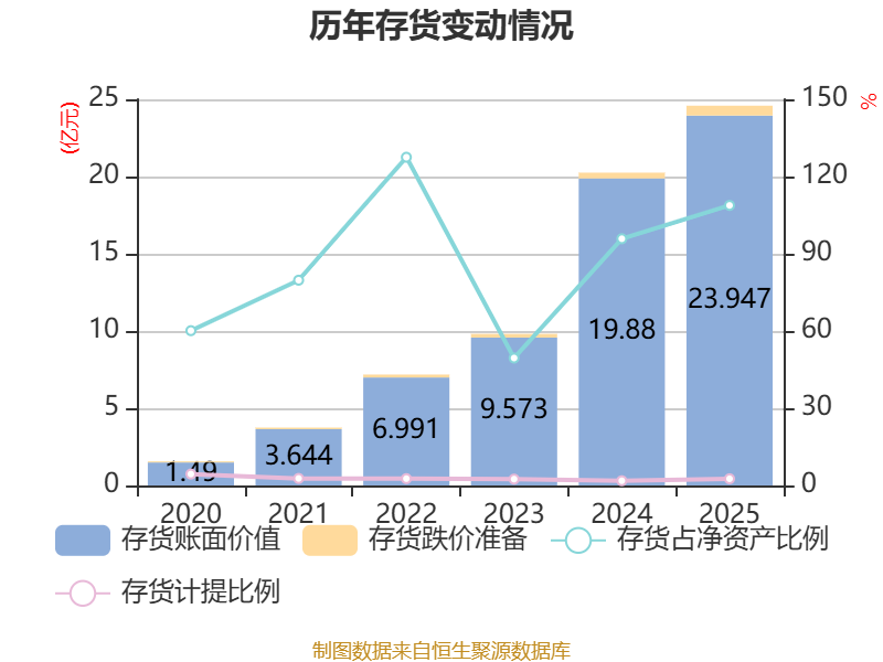 从存货变动来看,截至2025年末,公司存货账面价值为23.95亿元,占净资产的108.78%,较上年末增加4.07亿元。其中,存货跌价准备为6387.5万元,计提比例为2.6%。
