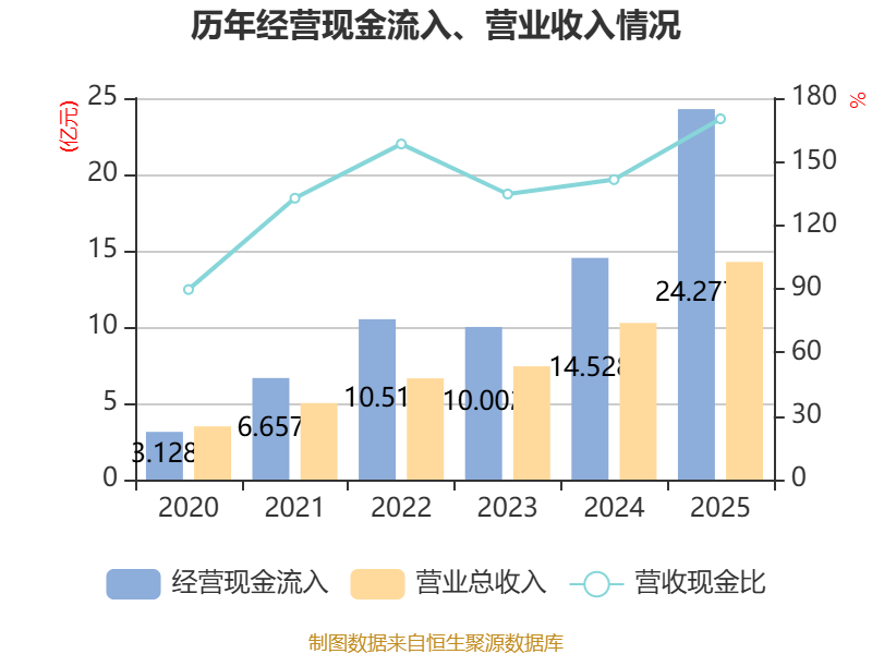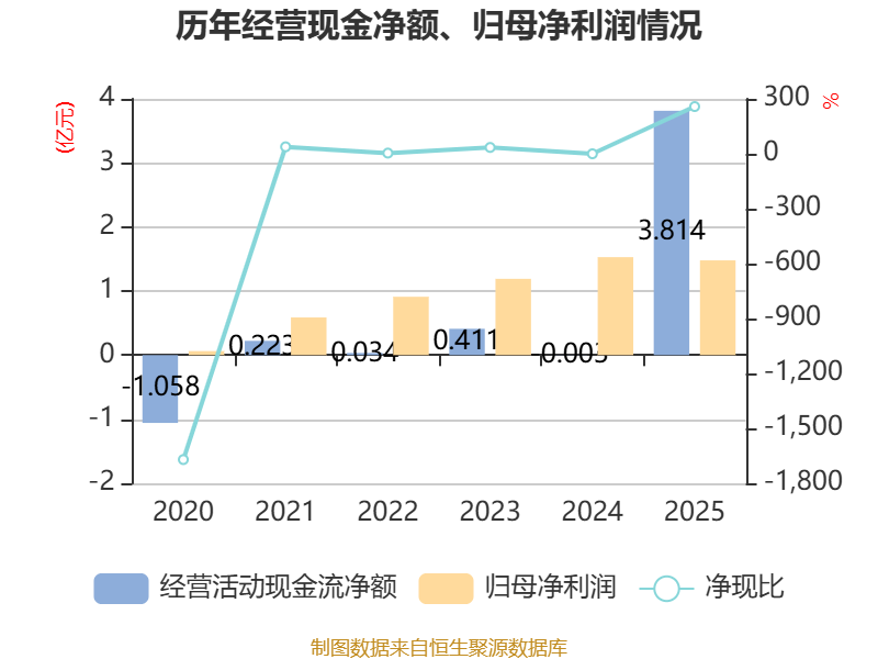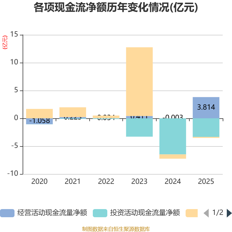 截至2025年,公司经营活动现金流净额为3.81亿元,同比增加3.82亿元;筹资活动现金流净额-1766.11万元,同比增加5966.21万元;投资活动现金流净额-3.34亿元,上年同期为-6.48亿元。