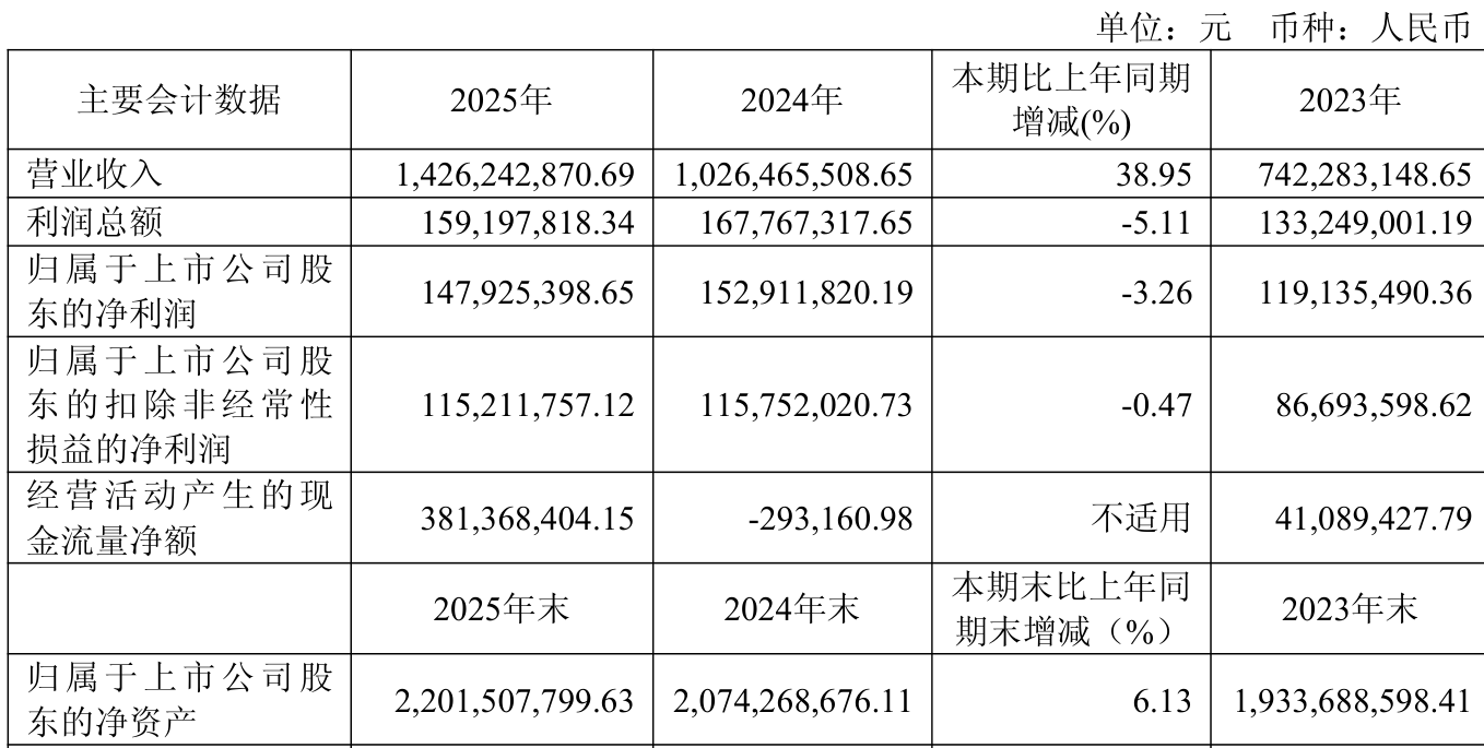 中证智能财讯京仪装备(688652)3月31日披露2025年年度报告。2025年,公司实现营业总收入14.26亿元,同比增长38.95%;归母净利润1.48亿元,同比下降3.26%;扣非净利润1.15亿元,同比下降0.47%;经营活动产生的现金流量净额为3.81亿元,上年同期为-29.32万元;报告期内,京仪装备基本每股收益为0.88元,加权平均净资产收益率为6.92%。公司2025年度分配预案为:拟向全体股东每10股派现1.25元(含税)。