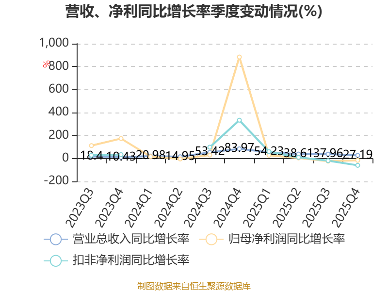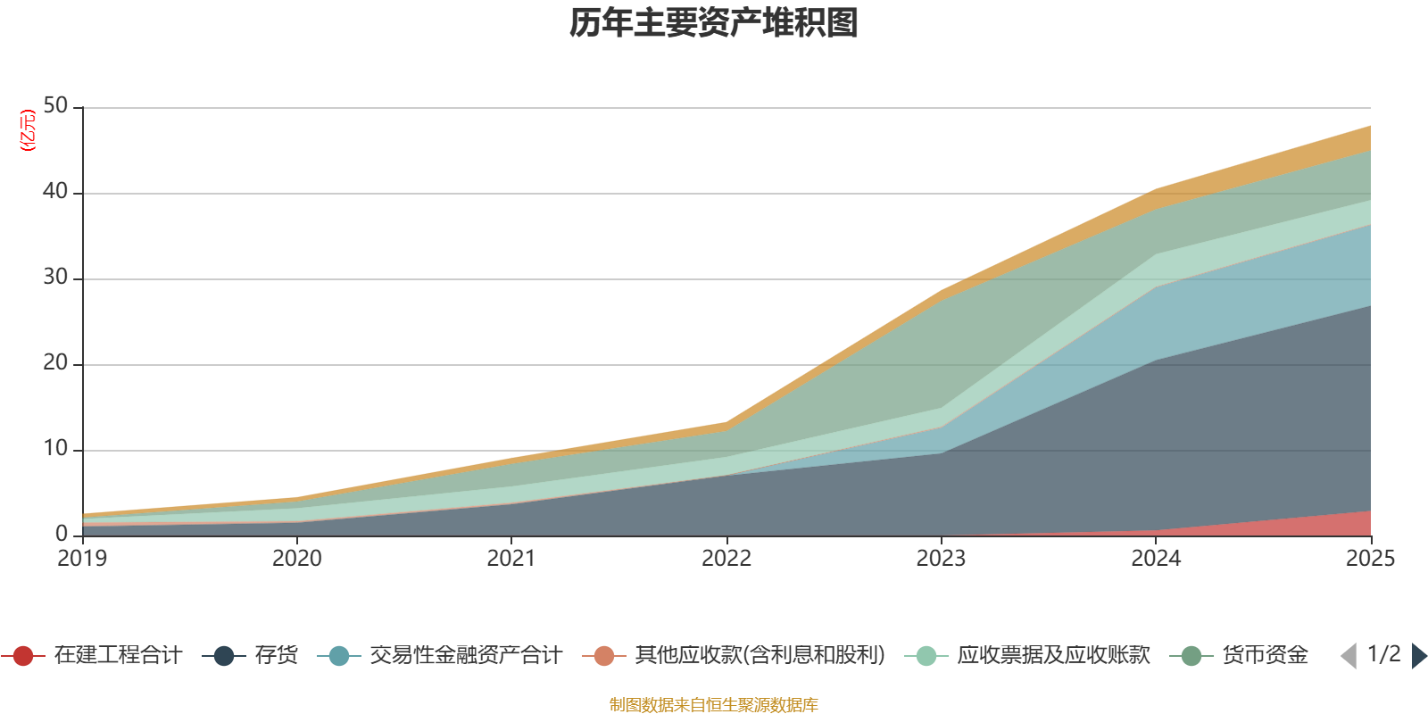 资产重大变化方面,截至2025年末,公司在建工程合计较上年末增加378.55%,占公司总资产比重上升4.51个百分点;应收票据及应收账款较上年末减少25.75%,占公司总资产比重下降3.51个百分点;交易性金融资产合计较上年末增加11.08%,占公司总资产比重下降1.28个百分点;存货较上年末增加20.46%,占公司总资产比重上升0.9个百分点。