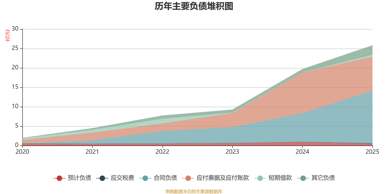 负债重大变化方面,截至2025年末,公司合同负债较上年末增加82.84%,占公司总资产比重上升9.97个百分点;应付票据及应付账款较上年末减少16%,占公司总资产比重下降7.49个百分点;其他应付款(含利息和股利)较上年末增加336.73%,占公司总资产比重上升1.38个百分点;预计负债较上年末减少46.01%,占公司总资产比重下降1.14个百分点。