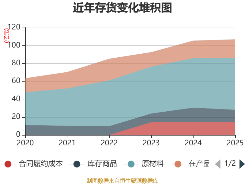 从存货变动来看,截至2025年末,公司存货账面价值为106.82亿元,占净资产的61.67%,较上年末增加1.44亿元。其中,存货跌价准备为8.39亿元,计提比例为7.28%。