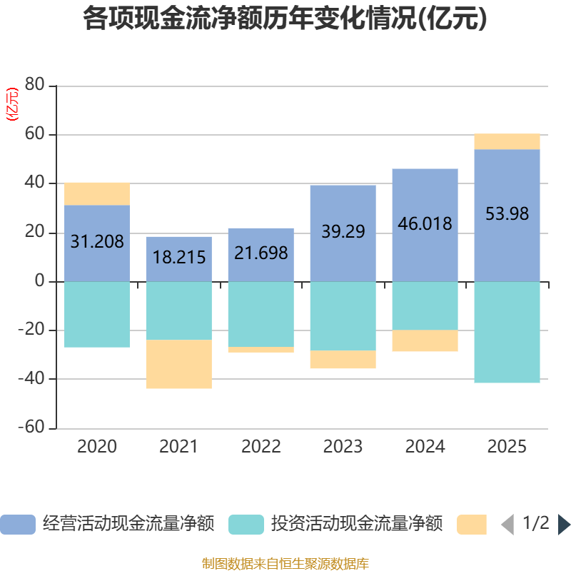 截至2025年,公司经营活动现金流净额为53.98亿元,同比增长17.3%;筹资活动现金流净额6.44亿元,同比增加15.15亿元;投资活动现金流净额-41.45亿元,上年同期为-19.88亿元。