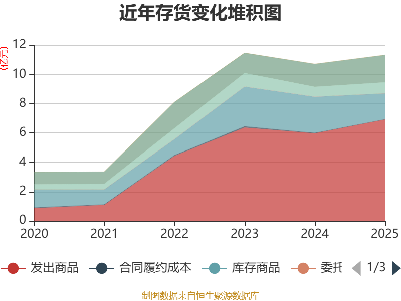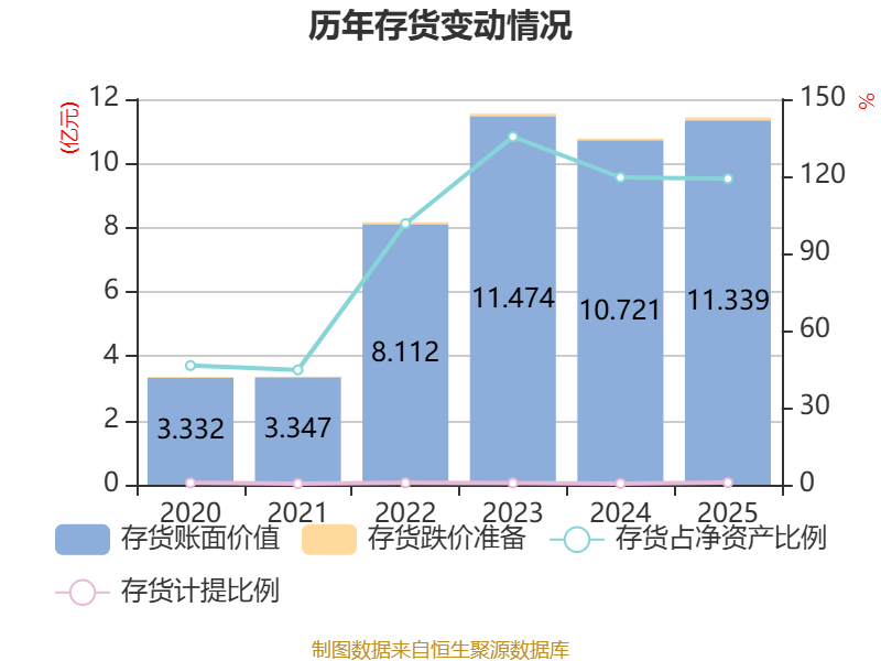 从存货变动来看,截至2025年末,公司存货账面价值为11.34亿元,占净资产的119.04%,较上年末增加6186.28万元。其中,存货跌价准备为921.3万元,计提比例为0.81%。