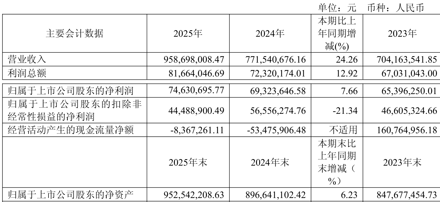 中证智能财讯天鹅股份(603029)3月31日披露2025年年度报告。2025年,公司实现营业总收入9.59亿元,同比增长24.26%;归母净利润7463.07万元,同比增长7.66%;扣非净利润4448.89万元,同比下降21.34%;经营活动产生的现金流量净额为-836.73万元,上年同期为-5347.59万元;报告期内,天鹅股份基本每股收益为0.62元,加权平均净资产收益率为8.11%。公司2025年度分配预案为:拟向全体股东每10股派现1.85元(含税)。