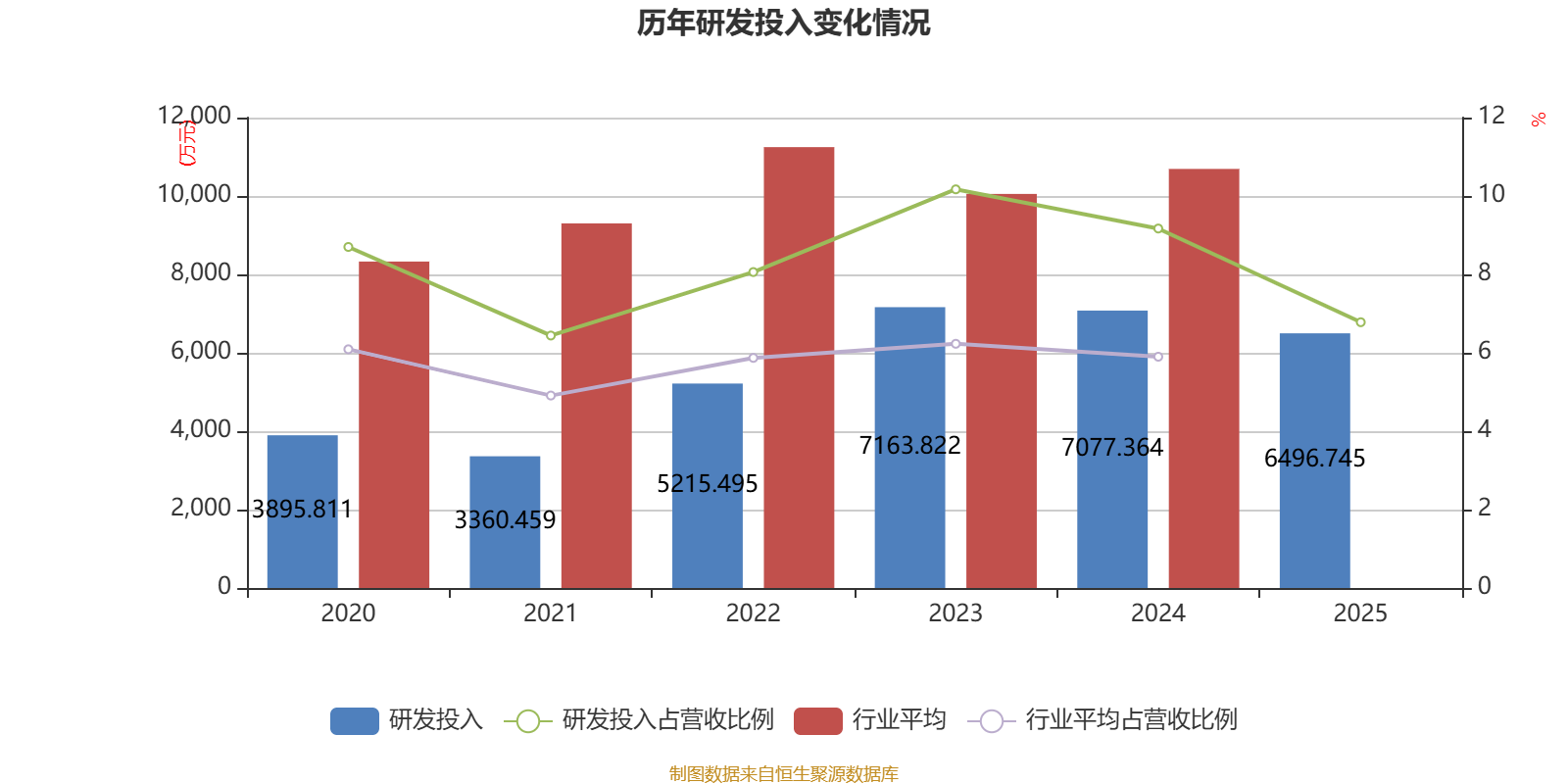 2025年全年,公司研发投入金额为6496.75万元,同比下降8.2%;研发投入占营业收入比例为6.78%,相比上年同期下降2.39个百分点。此外,公司全年研发投入资本化率为0%。
