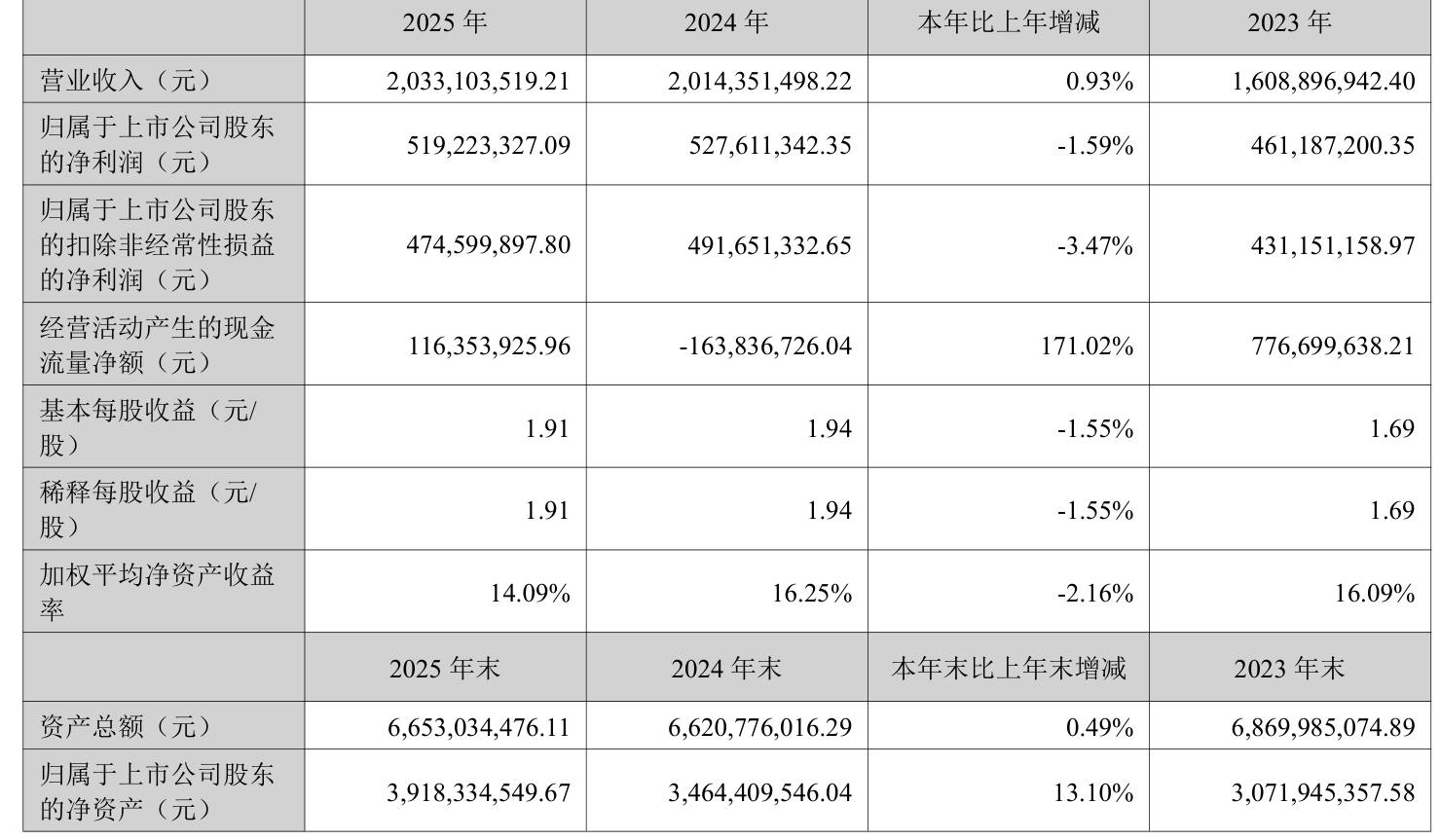 中证智能财讯帝尔激光(300776)3月31日披露2025年年度报告。2025年,公司实现营业总收入20.33亿元,同比增长0.93%;归母净利润5.19亿元,同比下降1.59%;扣非净利润4.75亿元,同比下降3.47%;经营活动产生的现金流量净额为1.16亿元,上年同期为-1.64亿元;报告期内,帝尔激光基本每股收益为1.91元,加权平均净资产收益率为14.09%。公司2025年度分配预案为:拟向全体股东每10股派现3.9元(含税)。
