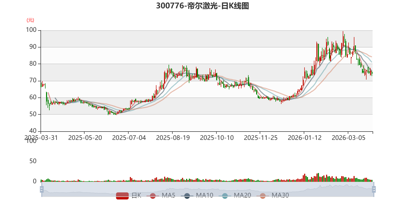 以3月30日收盘价计算,帝尔激光目前市盈率(TTM)约为39.28倍,市净率(LF)约5.2倍,市销率(TTM)约10.03倍。