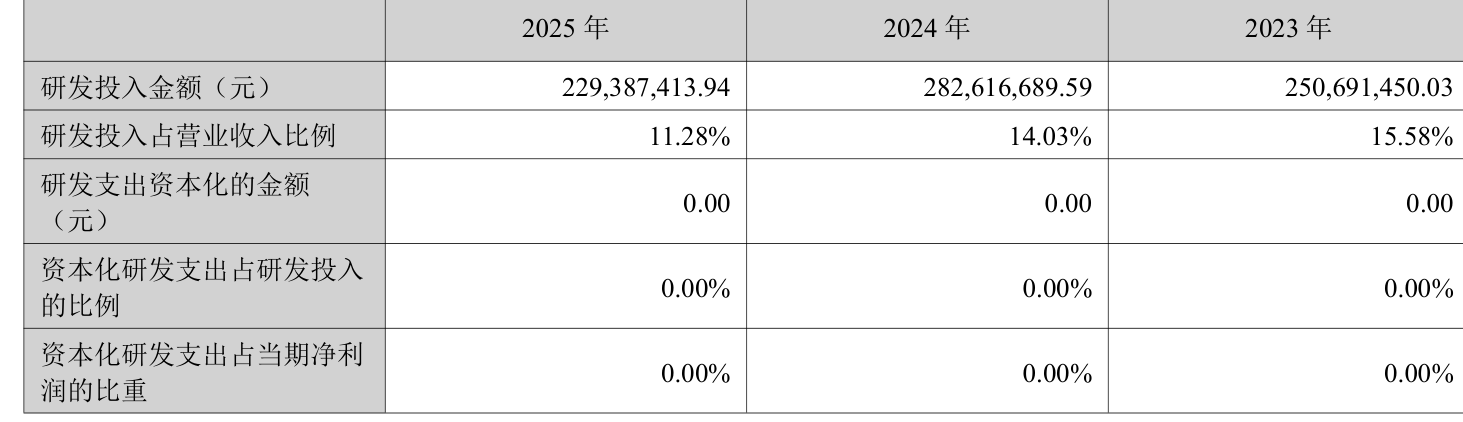 2025年全年,公司研发投入金额为2.29亿元,同比下降18.83%;研发投入占营业收入比例为11.28%,相比上年同期下降2.75个百分点。此外,公司全年研发投入资本化率为0%。