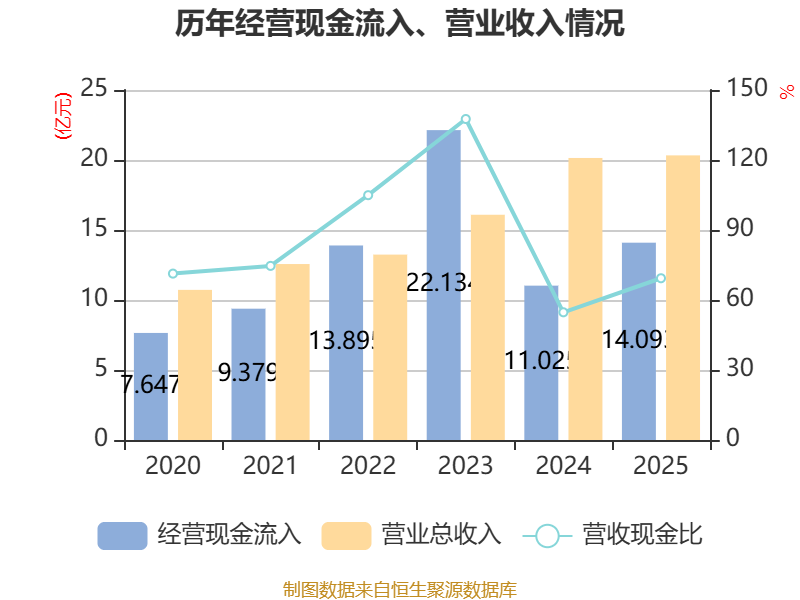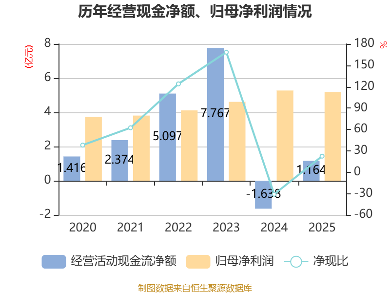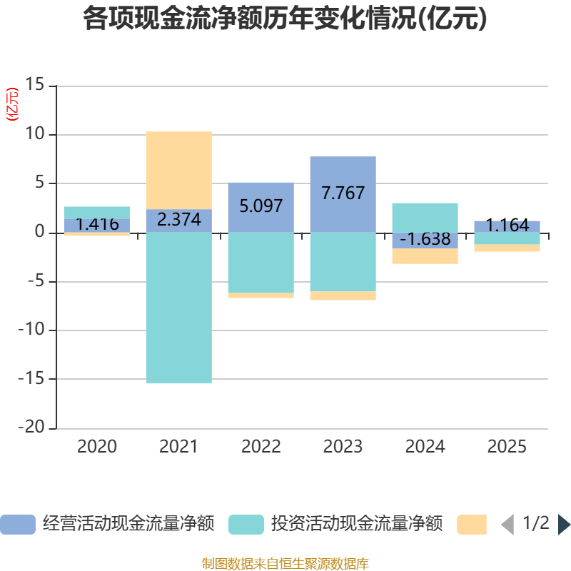 截至2025年,公司经营活动现金流净额为1.16亿元,同比增加2.8亿元;筹资活动现金流净额-7120.5万元,同比增加8563.58万元;投资活动现金流净额-1.24亿元,上年同期为2.99亿元。