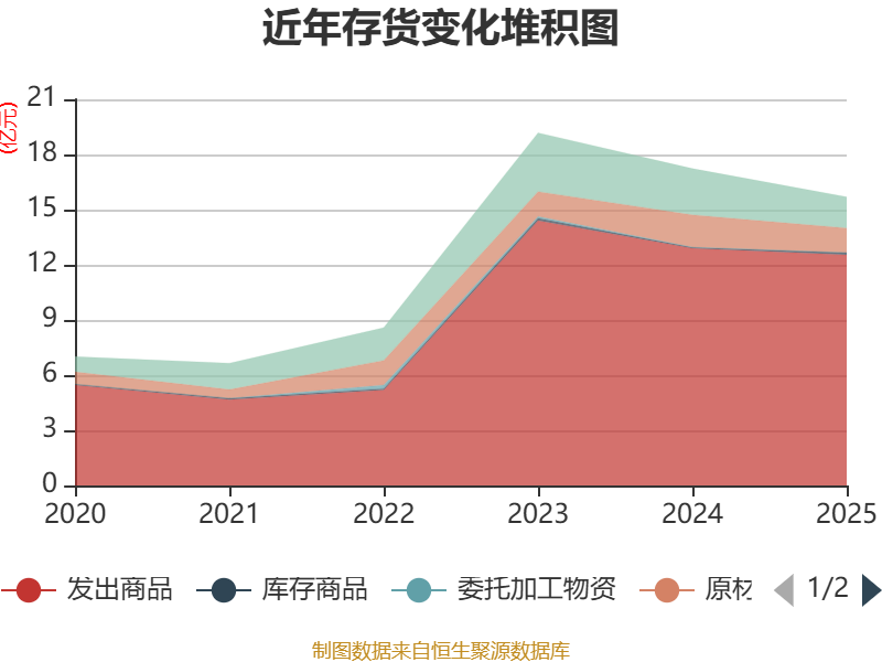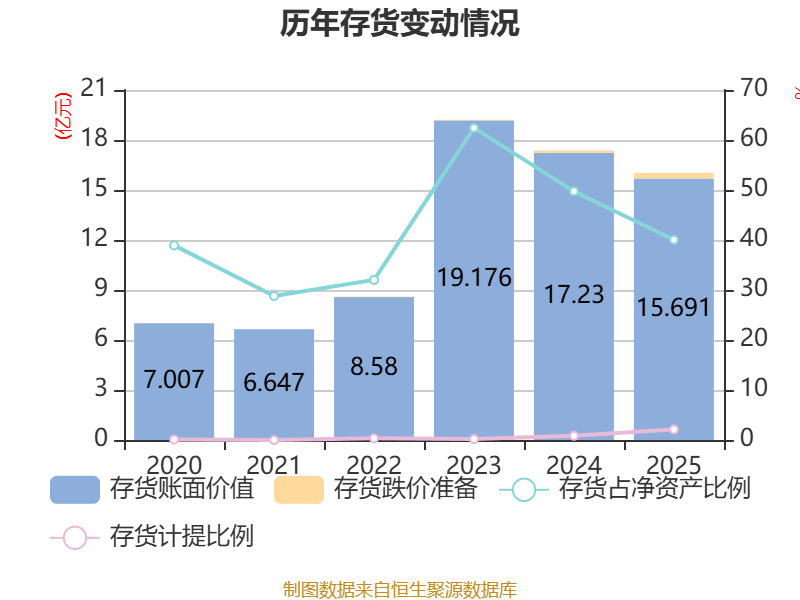 从存货变动来看,截至2025年末,公司存货账面价值为15.69亿元,占净资产的40.05%,较上年末减少1.54亿元。其中,存货跌价准备为3379.34万元,计提比例为2.11%。