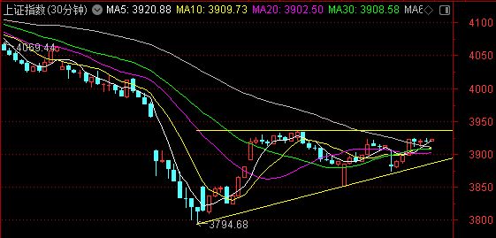 就30分钟K线图来看,上证指数最近的5根K线出现“单阳+横盘”的形态,指数点位在多根短期均线之上,且这些短期均线交织,这意味着变盘一触即发。