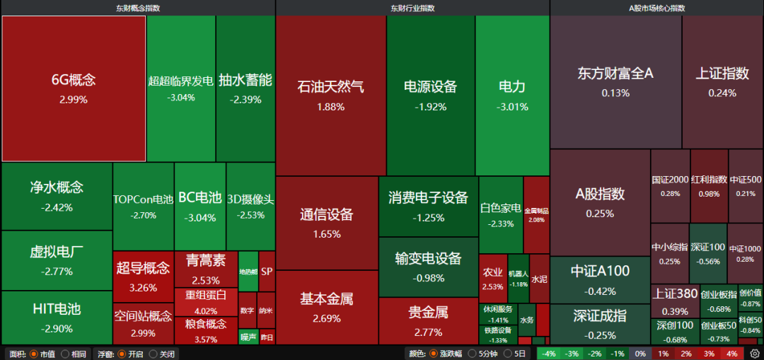 A股三大指数昨日涨跌不一,沪指涨0.24%,深证成指跌0.25%,创业板指跌0.68%。沪深京三市成交额超过1.9万亿。行业板块涨多跌少,贵金属、工业金属、航天装备、有色金属、医药商业、农化制品板块涨幅居前,电力、公用事业、光伏设备、保险板块跌幅居前。