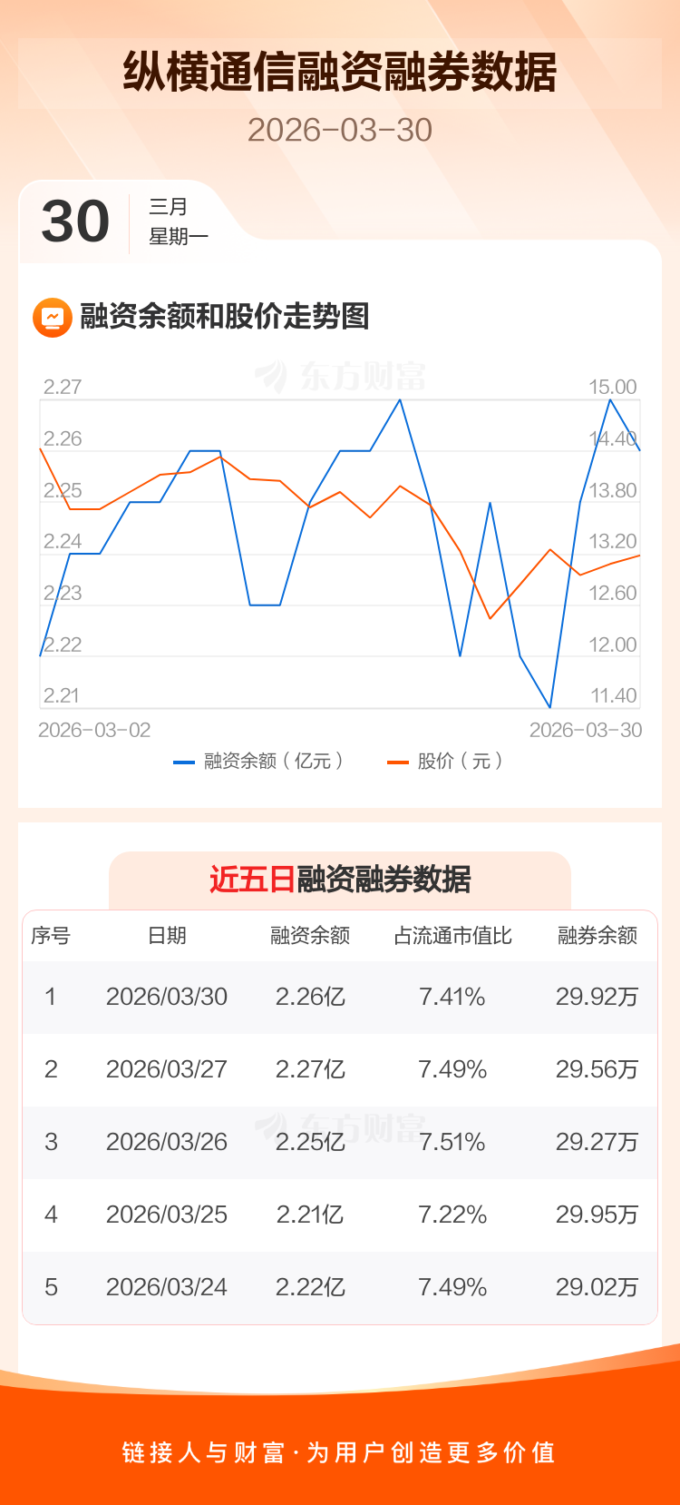 交易所最新数据显示,纵横通信于2026年3月30日获融资买入391.66万元,融资偿还484.15万元,当日融资净偿还92.49万元。目前,该股融资余额2.26亿,占流通市值比例为7.41%。