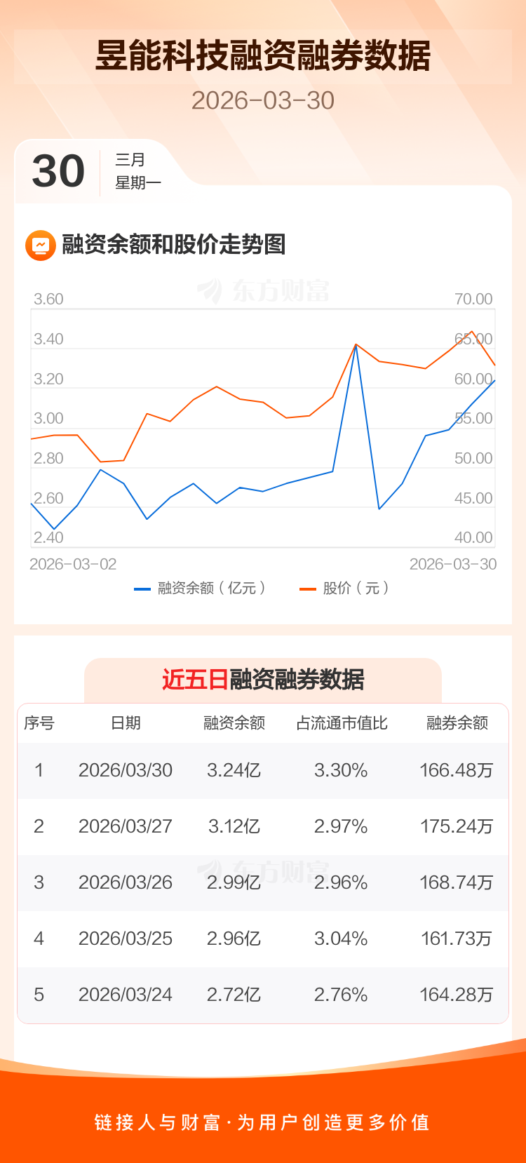 交易所最新数据显示,昱能科技于2026年3月30日获融资买入5642.79万元,融资偿还4474.80万元,当日融资净买入1167.99万元。目前,该股融资余额3.24亿,占流通市值比例为3.30%。