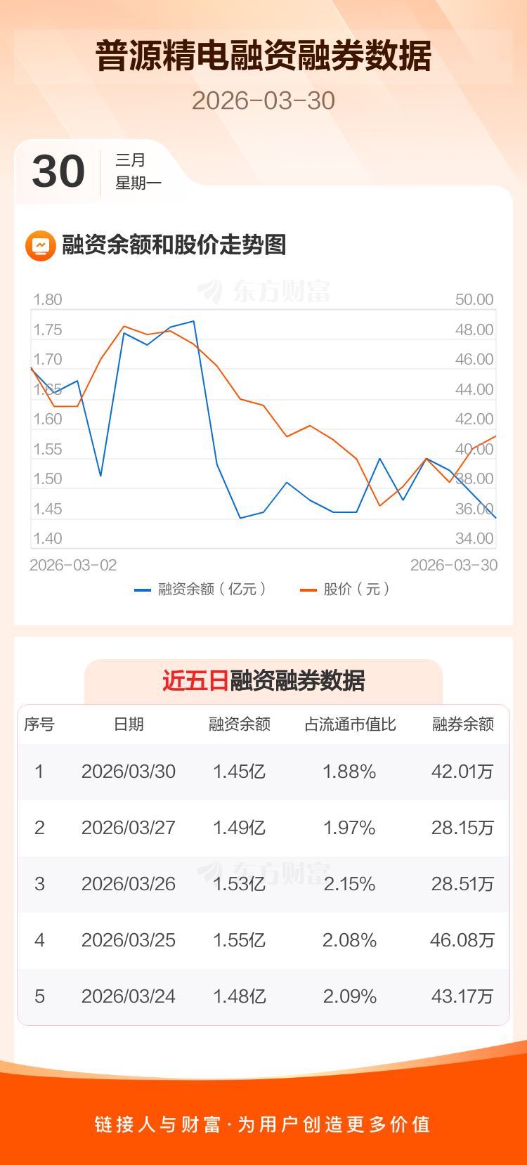 交易所最新数据显示,普源精电于2026年3月30日获融资买入844.24万元,融资偿还1238.27万元,当日融资净偿还394.03万元。目前,该股融资余额1.45亿,占流通市值比例为1.88%。