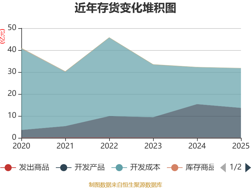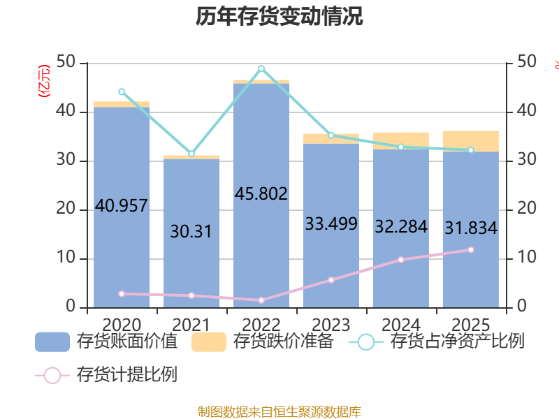 从存货变动来看,截至2025年末,公司存货账面价值为31.83亿元,占净资产的32.17%,较上年末减少4502.74万元。其中,存货跌价准备为4.24亿元,计提比例为11.76%。