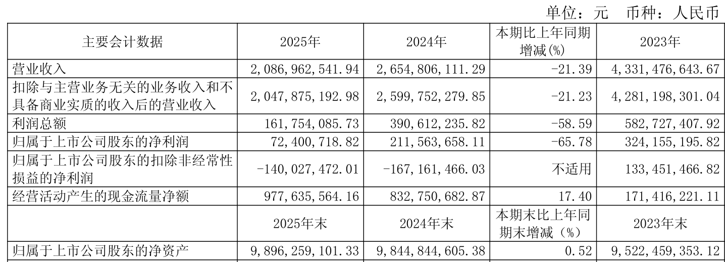 中证智能财讯大众交通(600611)3月31日披露2025年年度报告。2025年,公司实现营业总收入22.27亿元,同比下降21.69%;归母净利润7240.07万元,同比下降65.78%;扣非净利润亏损1.4亿元,上年同期亏损1.67亿元;经营活动产生的现金流量净额为9.78亿元,同比增长17.40%;报告期内,大众交通基本每股收益为0.03元,加权平均净资产收益率为0.73%。公司2025年度分配预案为:拟向全体股东每10股派现0.2元(含税)。
