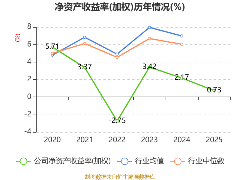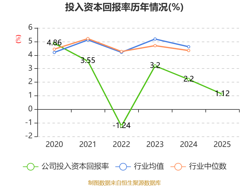 数据显示,2025年公司加权平均净资产收益率为0.73%,较上年同期下降1.44个百分点。公司2025年投入资本回报率为1.12%,较上年同期下降1.08个百分点。