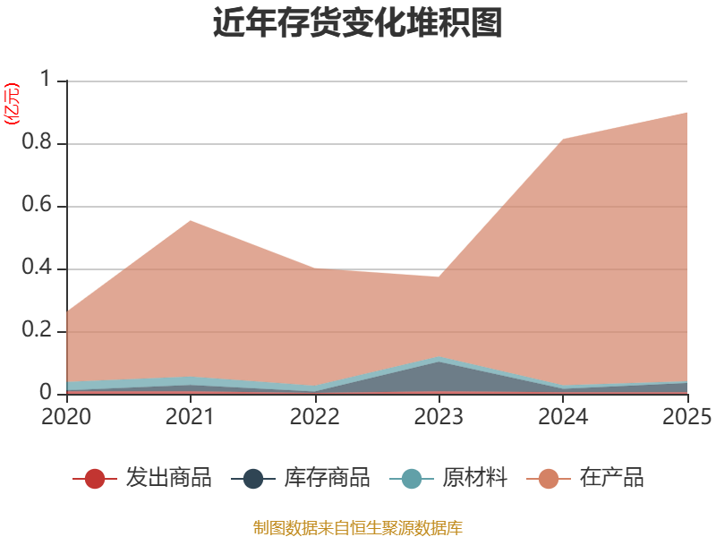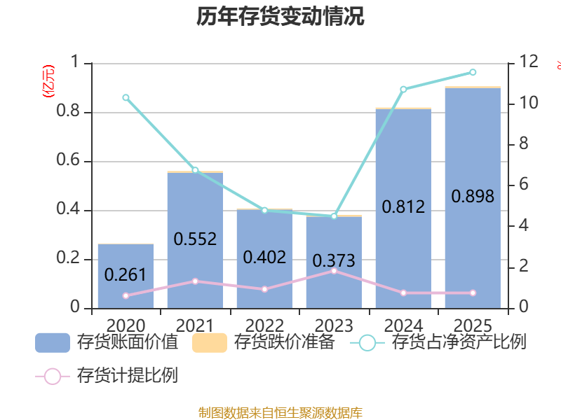 从存货变动来看,截至2025年末,公司存货账面价值为8975.68万元,占净资产的11.55%,较上年末增加853.5万元。其中,存货跌价准备为66.72万元,计提比例为0.74%。