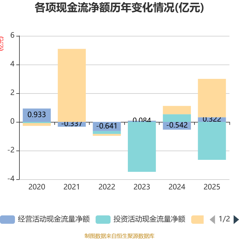 截至2025年,公司经营活动现金流净额为3217.57万元,同比增加8641.53万元;筹资活动现金流净额2.68亿元,同比增加2.1亿元;投资活动现金流净额-2.65亿元,上年同期为5349.96万元。