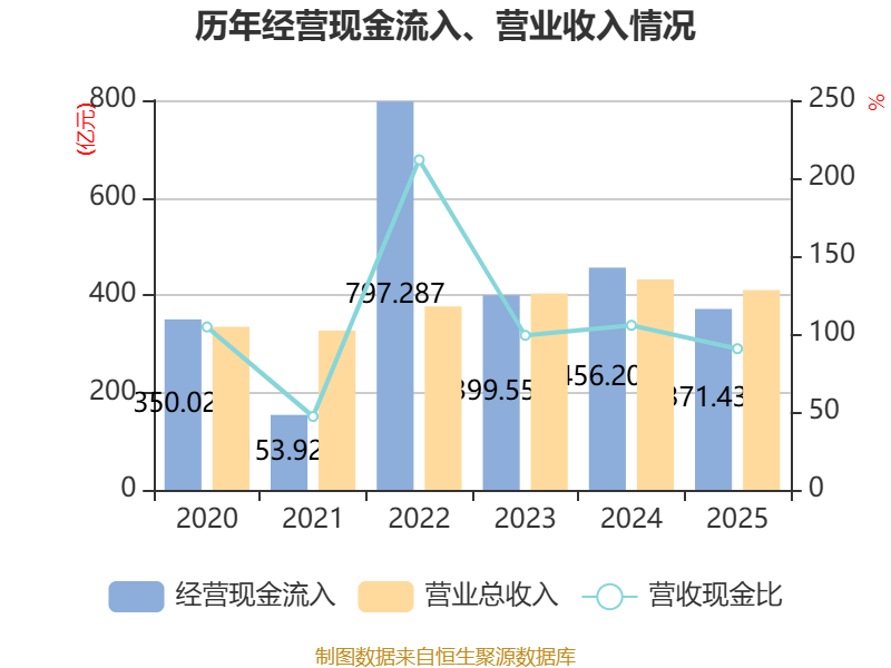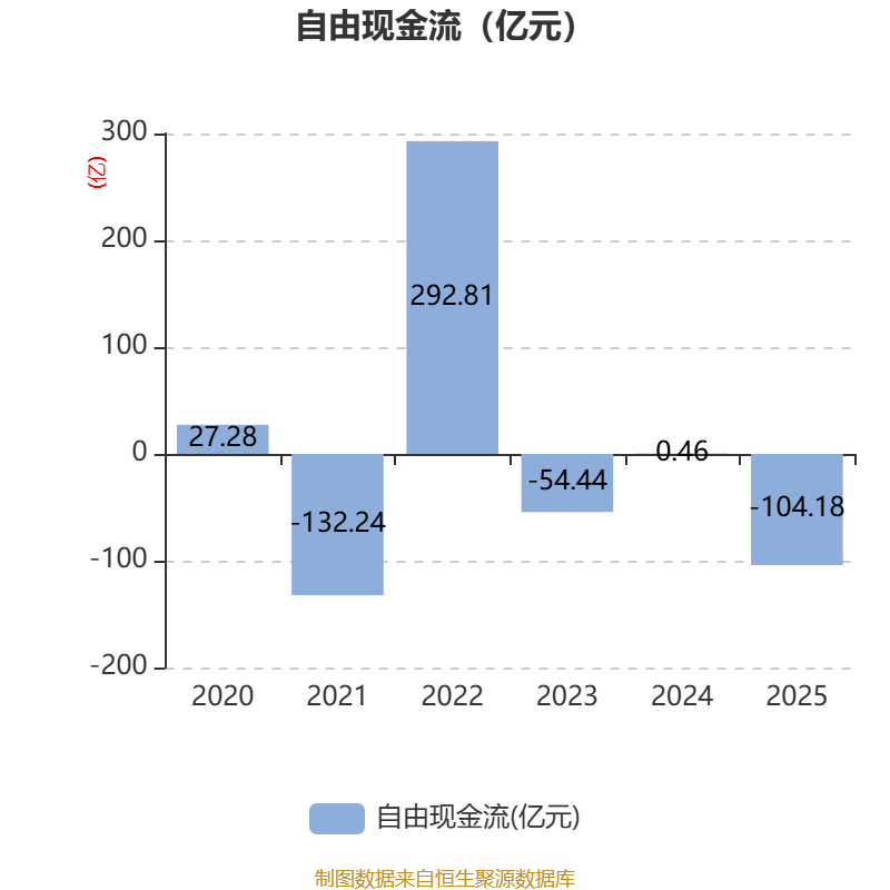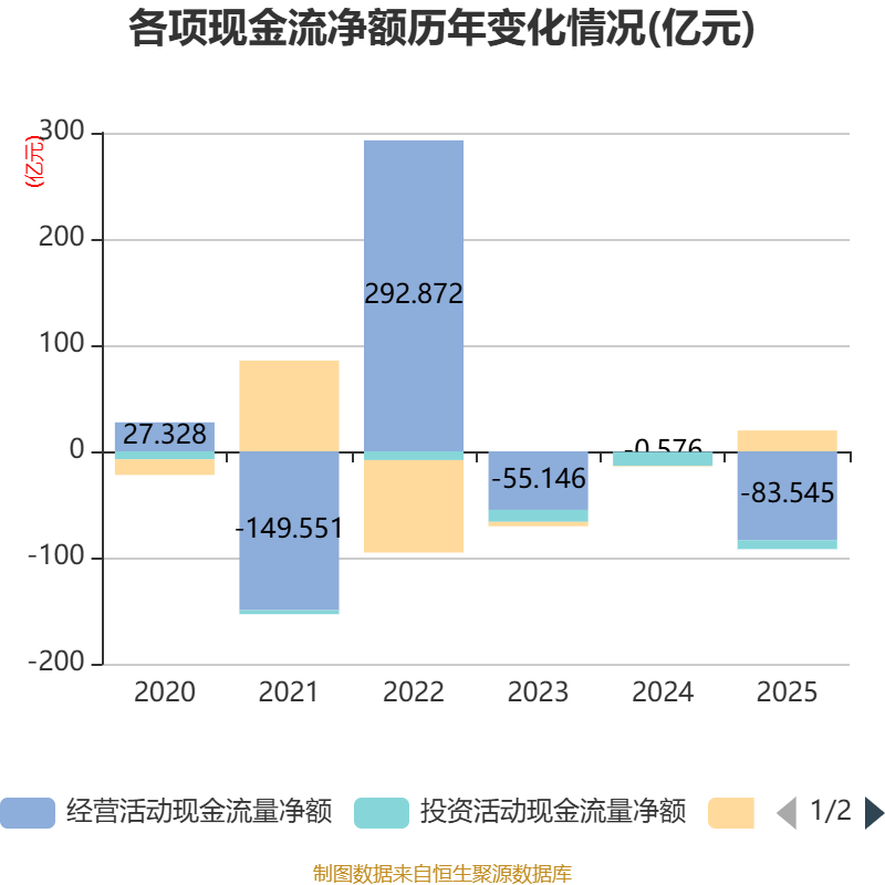 截至2025年,公司经营活动现金流净额为-83.54亿元,同比减少82.97亿元;筹资活动现金流净额19.63亿元,同比增加20.27亿元;投资活动现金流净额-8.47亿元,上年同期为-13.03亿元。