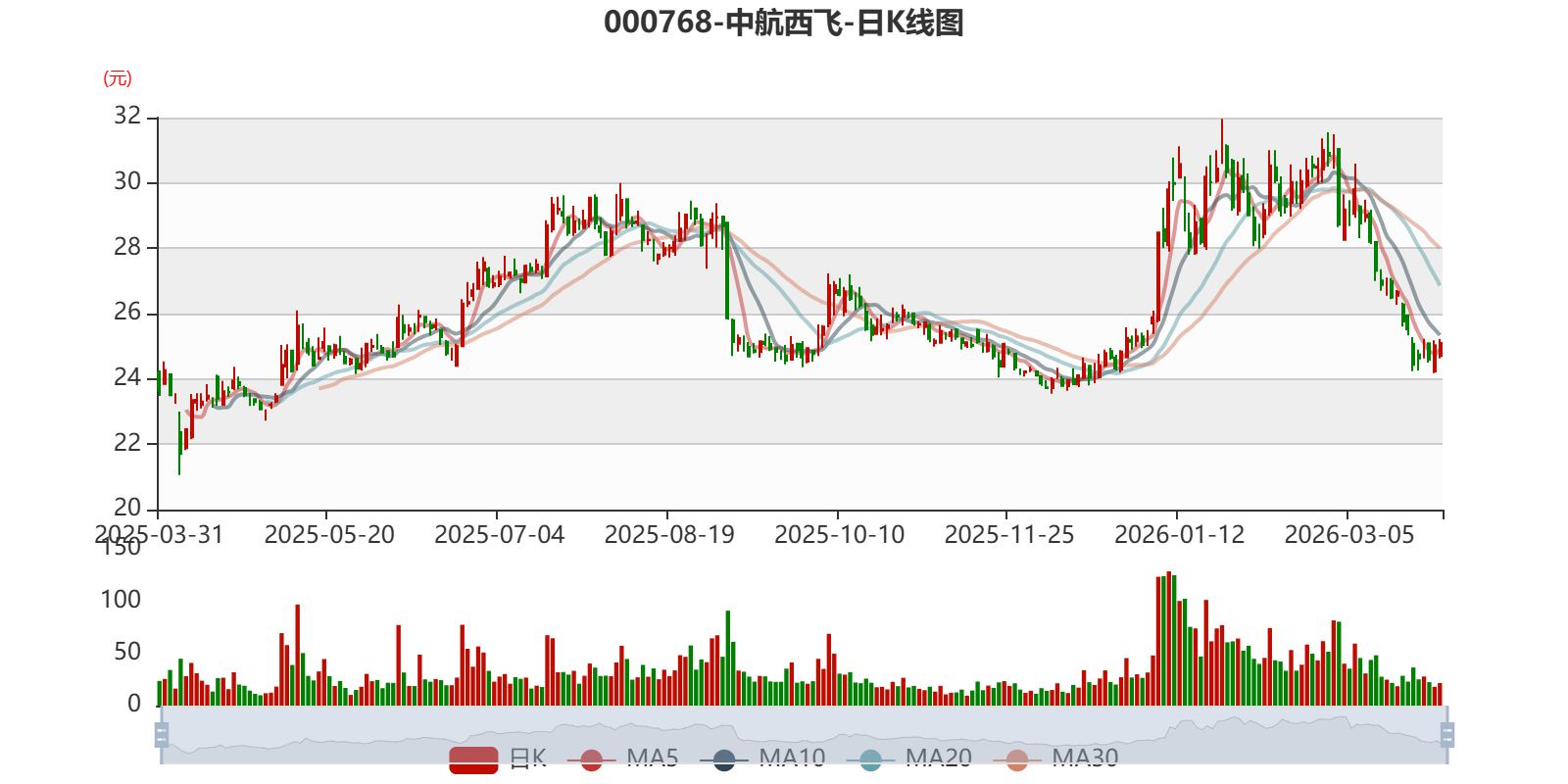 中证智能财讯中航西飞(000768)3月31日披露2025年年度报告。2025年,公司实现营业总收入410.14亿元,同比下降5.10%;归母净利润11.51亿元,同比增长12.49%;扣非净利润10.75亿元,同比增长16.69%;经营活动产生的现金流量净额为-83.54亿元,上年同期为-5764.53万元;报告期内,中航西飞基本每股收益为0.4149元,加权平均净资产收益率为6.32%。公司2025年度分配预案为:拟向全体股东每10股派现1.5元(含税)。