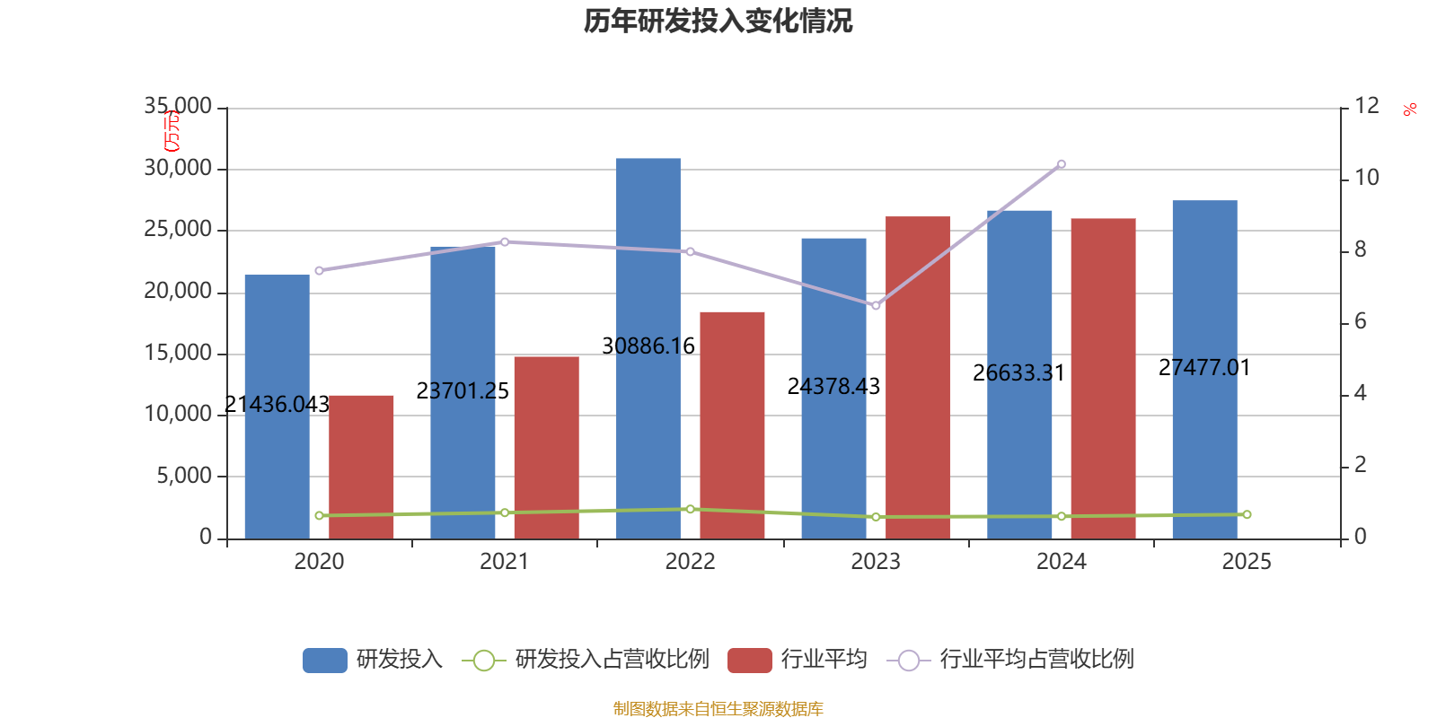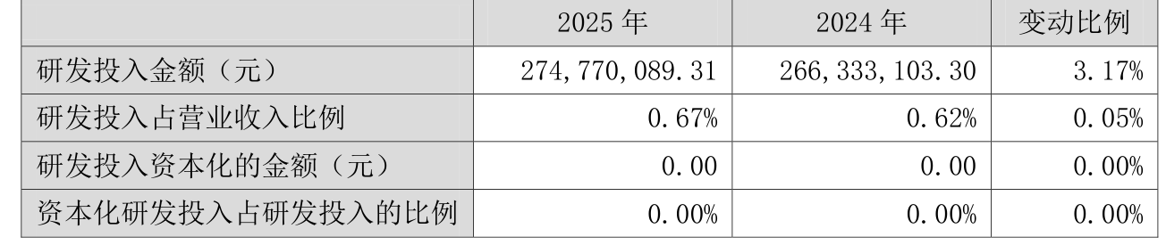 2025年全年,公司研发投入金额为2.75亿元,同比增长3.17%;研发投入占营业收入比例为0.67%,相比上年同期上升0.05个百分点。此外,公司全年研发投入资本化率为0%。